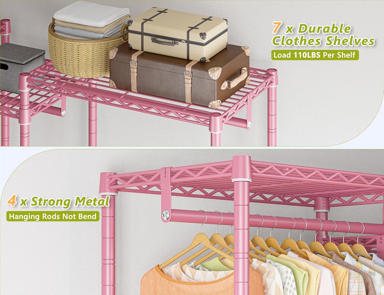 - 【Easy to Assemble & Great Service】Pink clothing rack is stable and easy to clean.No tools required, easy to install (usually takes only 20-30 minutes).Just be sure to read the assembly directions carefully before you start putting freestanding clothing racks together. If you have any problems about clothes hanging rack, please feel free to let us know, we will do our best to solve the problem for you.