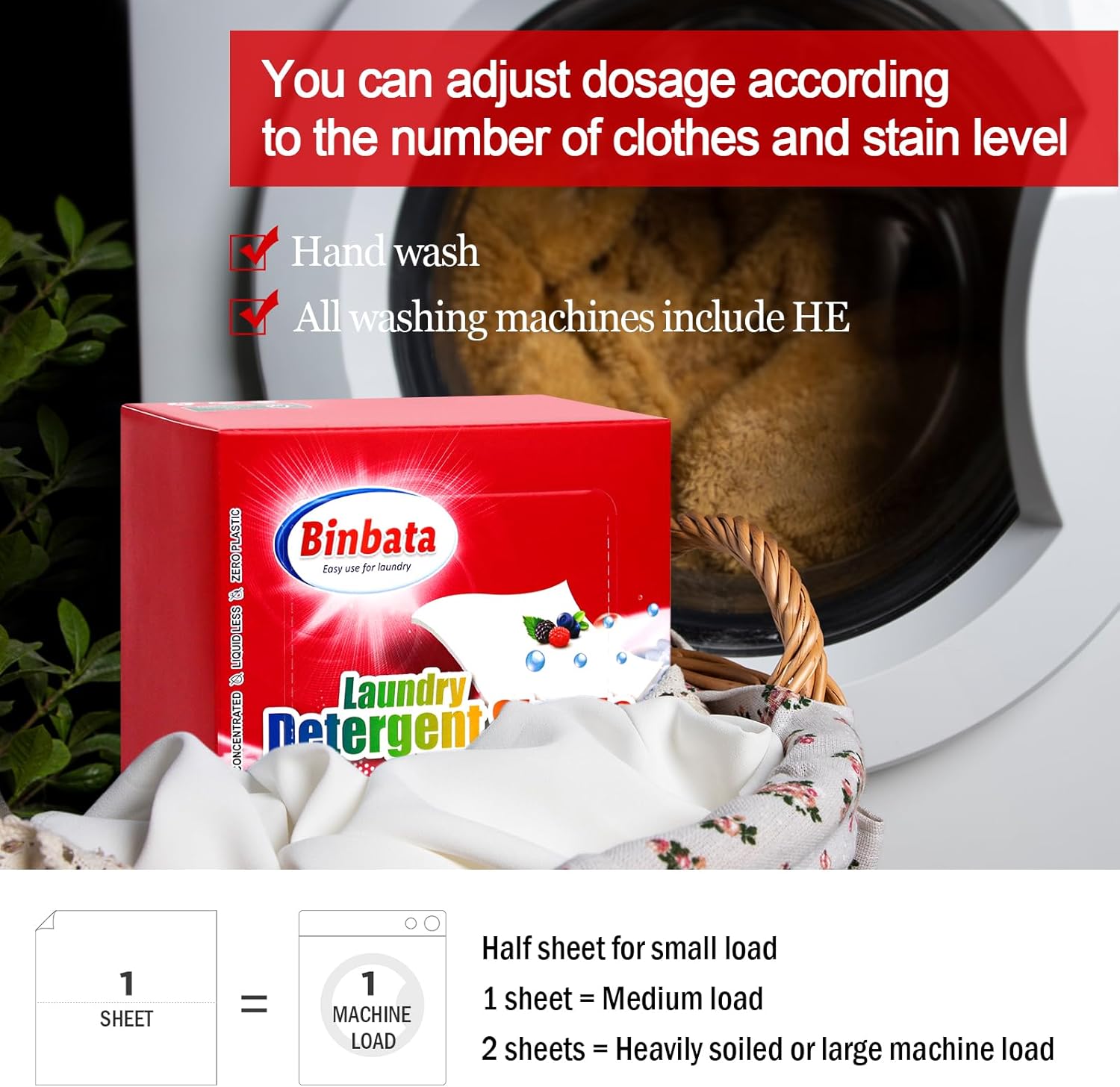 - 𝟖𝐗 𝐃𝐞𝐞𝐩 𝐂𝐥𝐞𝐚𝐧𝐬𝐢𝐧𝐠 𝐏𝐨𝐰𝐞𝐫: Binbata laundry detergent strips adopt polymer concentration technology, small size but thick enough with super cleaning power, highly concentrated detergent, perfectly deal with laundry difficulties such as sweat stains, beverage stains, fruit stains, tea stains, coffee stains… All ingredients are NO HARSH CHEMICALS