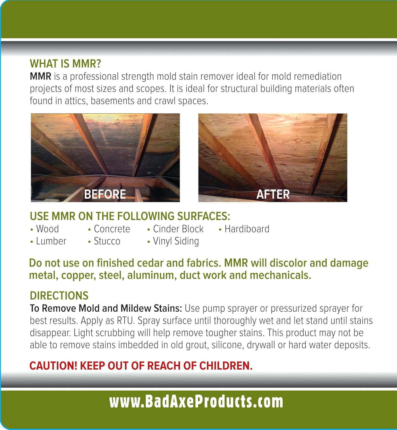 - REMOVE STUBBORN MOLD STAINS- Bad Axe MMR instant spray cleaner removes the stains left behind from black mold. Mold Stains deep below porous surfaces can be hard to remove and Bad Axe MMR is designed penetrate most all porous surfaces