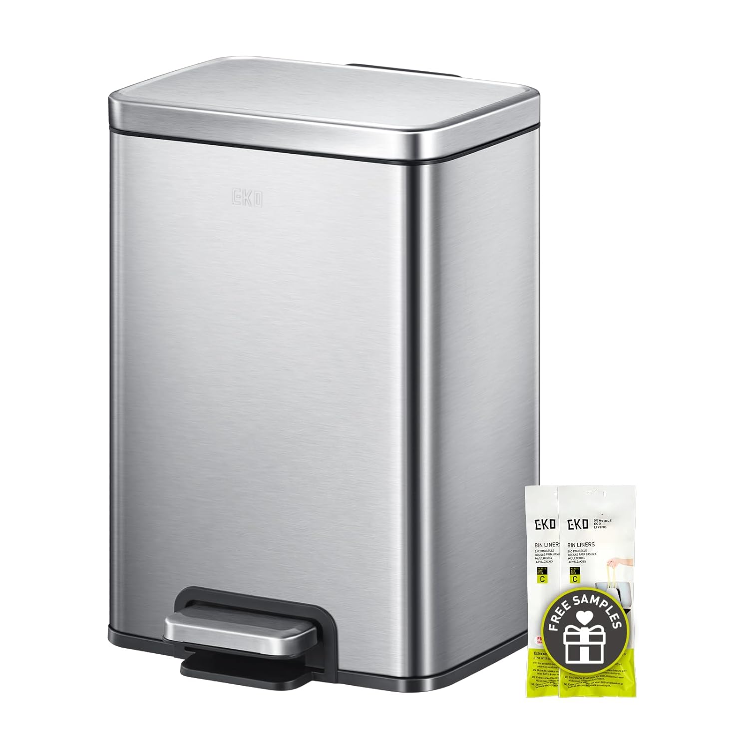 EKO Madison 12L / 3.2 Gal Bathroom Trash Can with Lid and Removable Inner Basket, Rectangular Small Step Trash Can, Brushed Stainless Steel