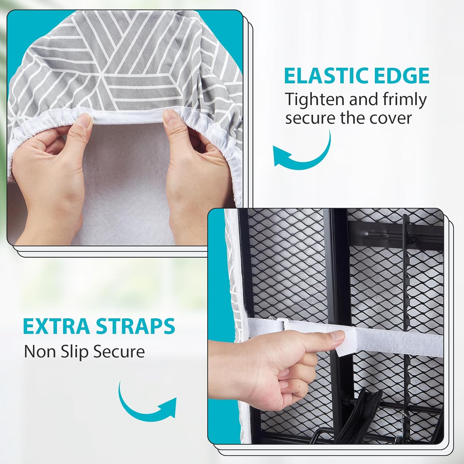 - HOOK AND LOOP FASTENERS AND ELASTICIZED EDGES: Come with two hook and loop fasteners can pull the cover surface tight and straight with tension straps for universal fit. The tailor made high quality elastic skirt can firmly fix the ironing cover so that it is tightly attached to the ironing board