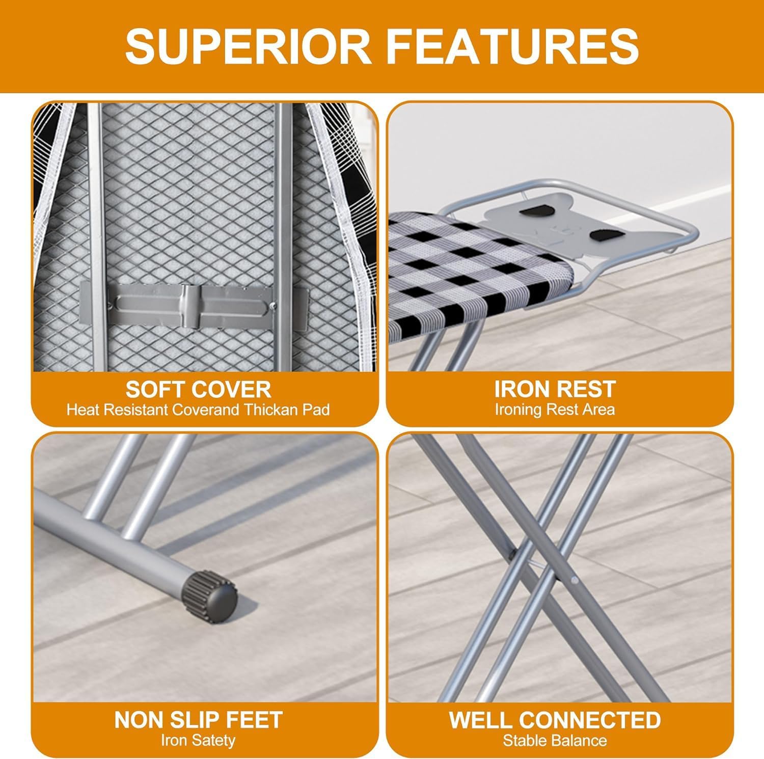 Ironing Board 13" X 43" W/Extra Thick Heavy Duty Padded Cover, Height Adjustable,Heat & Scorch Resistant Fabric, Anti-Skid Feet, Extra Wide, Easy to Fold Checkered Gray