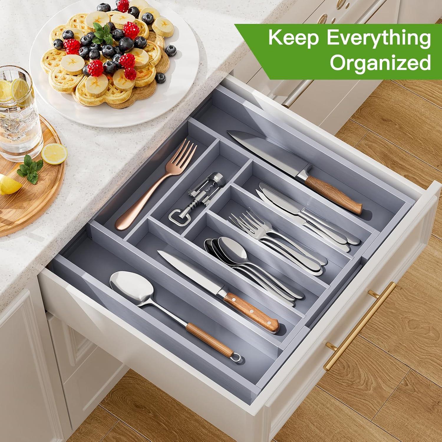 - Expandable and Adjustable Utensil Organizer: Designed with 6-8 compartments, the silverware organizer can save space while accommodating multiple items, which is expandable from 10.31 inches to 16.54 inches wide with smooth sliding.