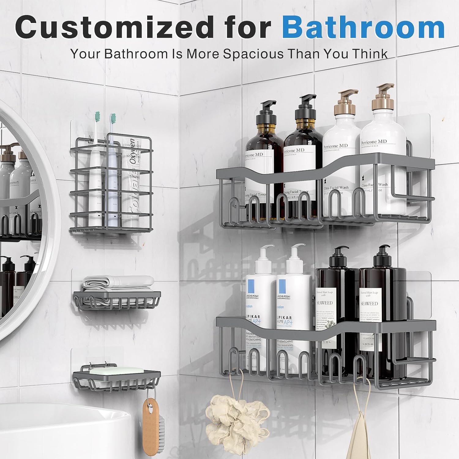- 5 Hanging Shower Organizer Set for Sufficient Bathroom Storage Space:The bathroom organizer comes with 5 pieces for different uses, including 2 shower caddies, 2 soap holders,1 toothbrush holder and 5 adhesives. Accommodate wash supplies or cooking seasonings easily with large capacities to make full use of space and facilitate your life; ideal for the dorm/bathroom/kitchen/toilet/tool room.