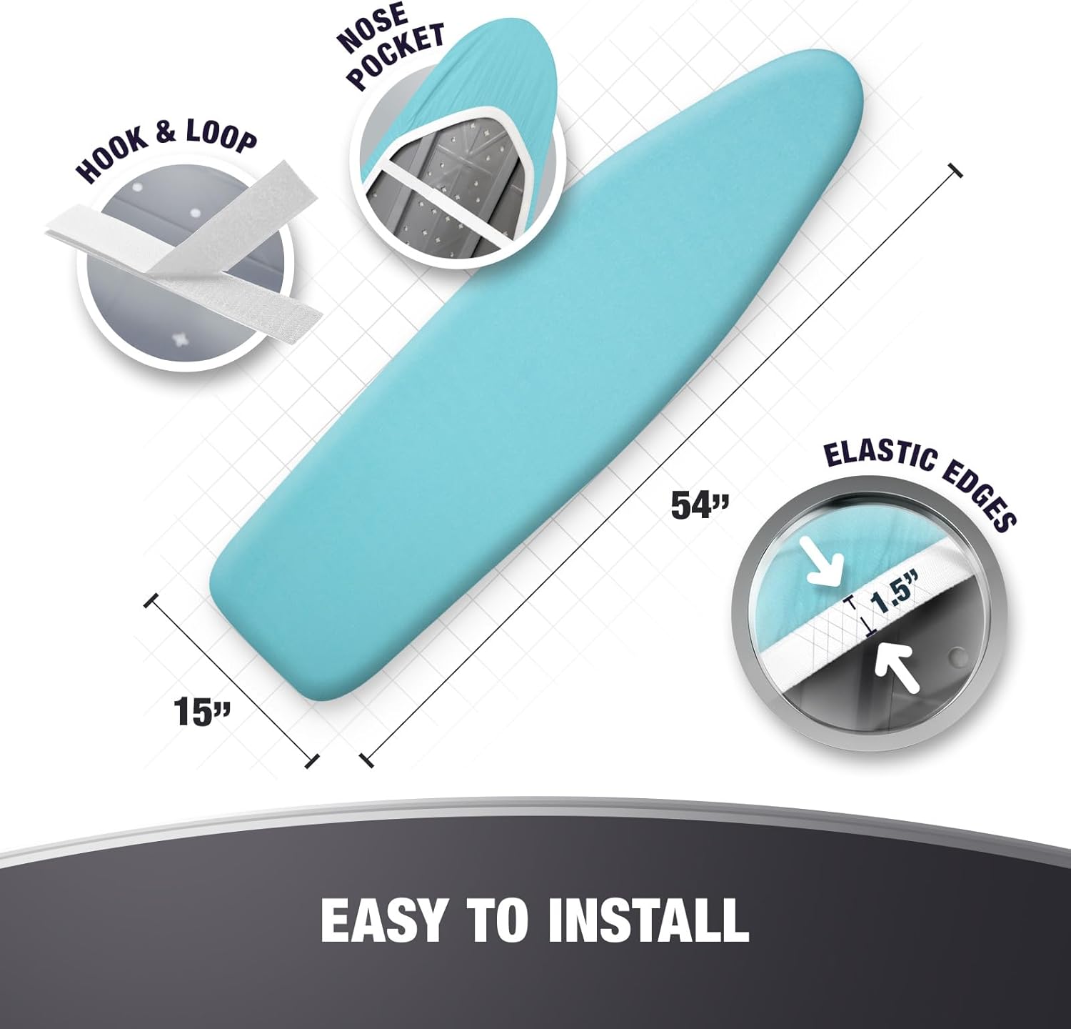 Extra Thick Ironing Board Covers with Pad Standard Size 15x54, Heat Reflective Full Scorch Resistant Padding, Snug Fit Non-Slip Nose Pocket Fastener Straps Elastic Edges, Turquoise