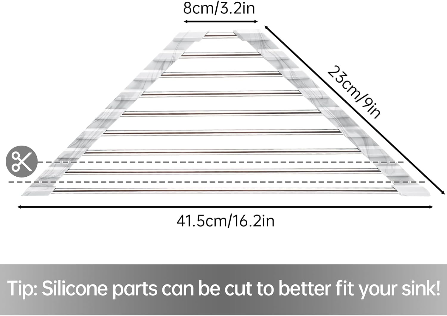 - ✔️【Small Over Sink Drying Rack】A handy tool that allows you to easily rinse and dry small items to keep your kitchen clean and organized. The triangle shape makes full use of your kitchen sink corner space and is designed for maximum stacking ability to efficiently dry dishes with proper drainage and ventilation. Top Length: 3.2”, Bottom Length: 16.2”, Side Length: 9”. Color: Marble.