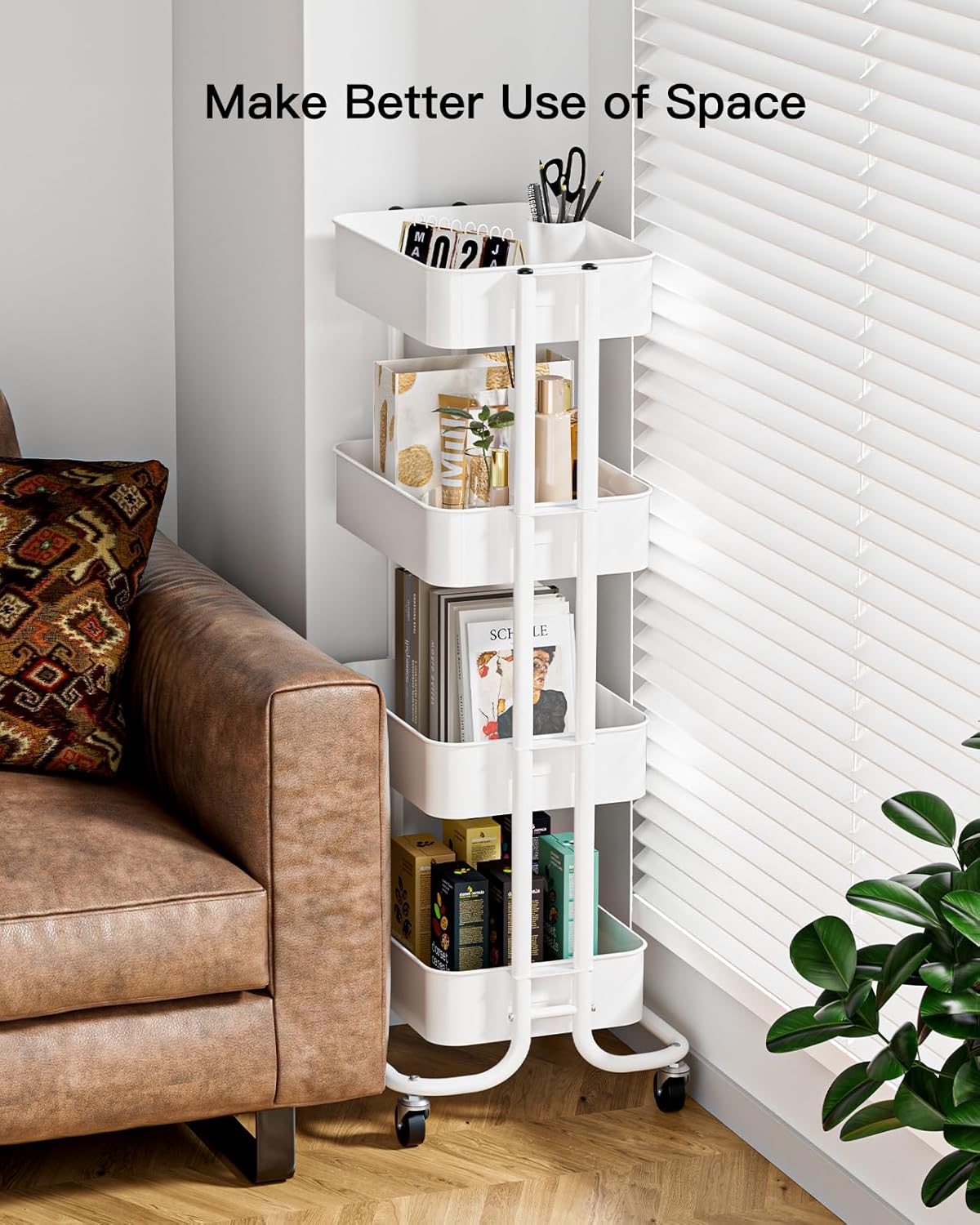 - Additional Utility Storage:Do you often feel that you don't have enough storage space? In fact, there is still a lot of space to be explored by using this utility cart. This 4 tier rolling cart features storage baskets with 16.77inch* 13.58inch interior dimensions. Easily make better use of your space by adding a rolling utility cart while only occupying minimal floor space in your kitchen, laundry room, or craft area. It also can be switched to a craft cart, art cart, book cart and makeup cart.
