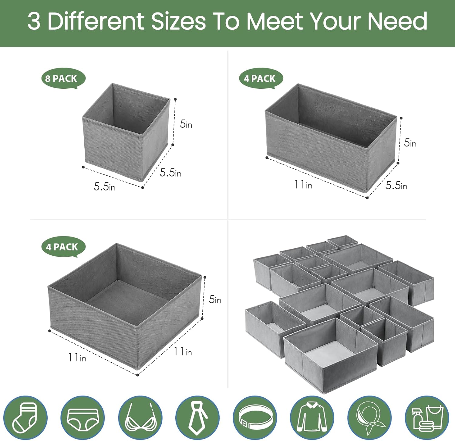 - 【Various Sizes 】 You will receive a 16-pack bra and sock organizers. 4 large square bins with 4 cardboards(11"x11"x5.1"), 4 rectangle bins with 4 cardboards(11"x5.5"x5.1"), 8 small square bins without cardboard(5.5"x5.5"x5.1"). Every organizer does the trick for a variety of storage needs! Making messy drawers organized.