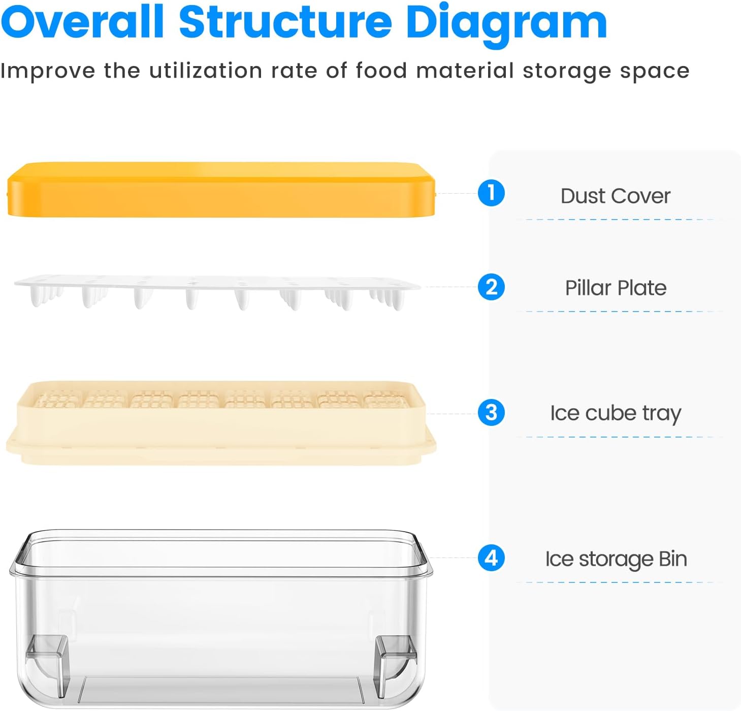 - Food Grade Material & BPA Free:This ice trays for freezer with lid and bin are made of food grade PP material, which is safe and can be frozen and used repeatedly for a long time.The ice cube tray is NOT DISHWASHER SAFE