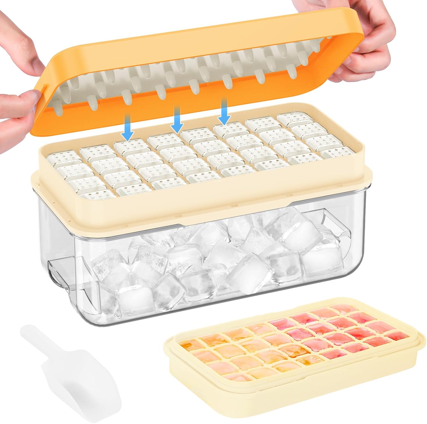 - Saving Space:Ice tray can be stacked and stored to save space. Contains: 1*32-pcs ice cube tray,ice scoop, lid, pillar plate, and ice cube storage bin that holds nearly 120 ice cubes.Size: 10.2 x 5.1 x 4.7"