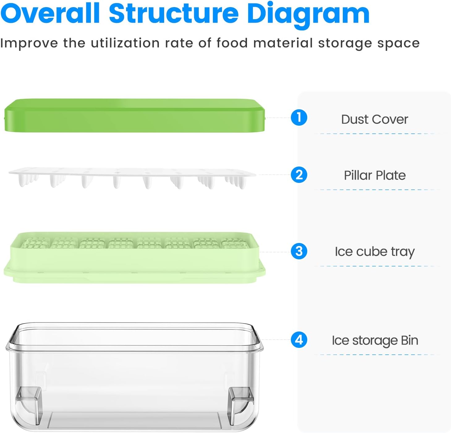 - Saving Space:Ice tray can be stacked and stored to save space. Contains: 1*32-pcs ice cube tray,ice scoop, lid, pillar plate, and ice cube storage bin that holds nearly 120 ice cubes.Size: 10.2 x 5.1 x 4.7"