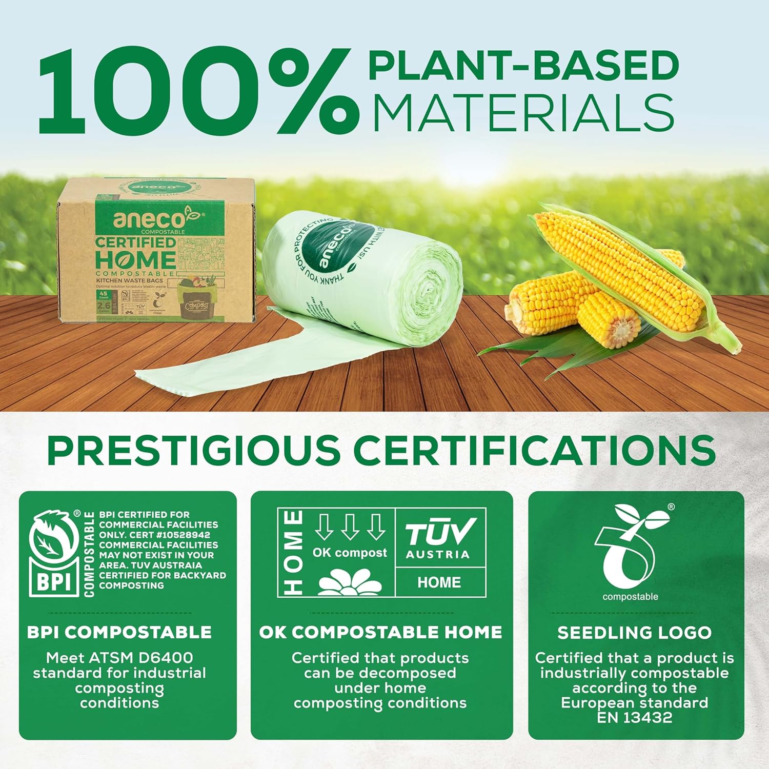 - 🍀 Made from entirely renewable resources such as corn starch and plant-based materials, ANECO compostable bags 2.6 gallon decomposes naturally into CO2, water and organic biomass within one year, leaving no traces of plastic in the environment. It also meets strict standards and earned prestigious certification from BPI Compostable (US standard ASTM D6400), TUV Austria (OK Compost Home) and European Bioplastics (Seedling Logo) so you can totally buy with confidence.
