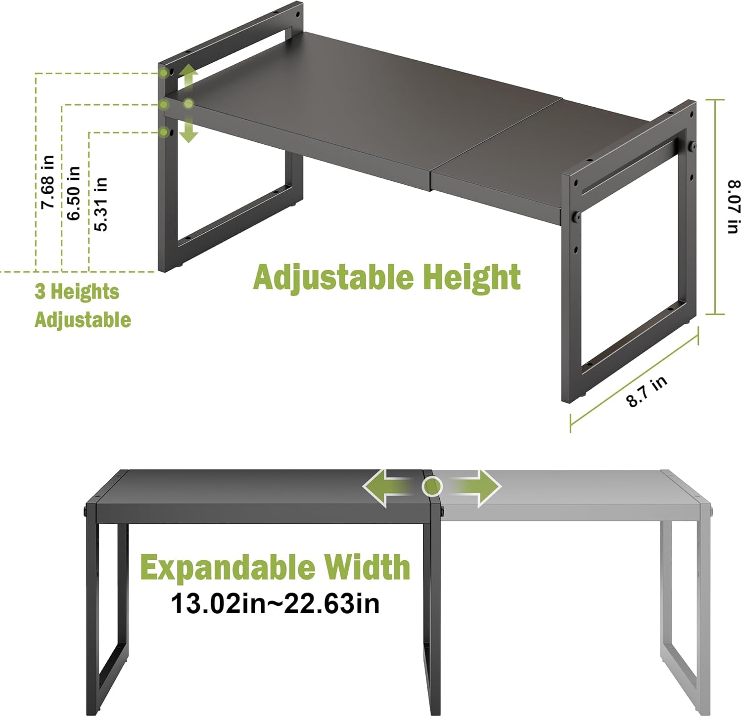 - 【Expandable & Stackable Cabinet Organizer】The length and height of this shelf can be adjusted, The length of expandable shelf can be adjusted from 13 to 23 Inches according to the different space; The Height can be adjusted from 5.1 inches to 7.5 Inches depending on how you want to arrange your space.