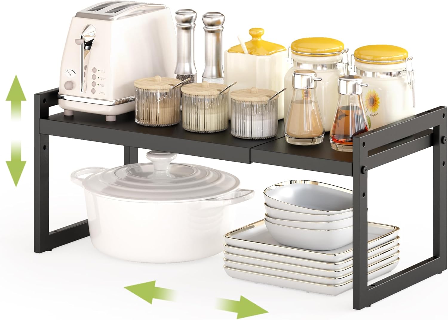 DOLALIKE Expandable kitchen Countertop Organizer, Stackable Cabinet Shelf Organizers, Space Saving Spice Rack Pantry Storage for Bathroom Office (Black, 1 Pack)
