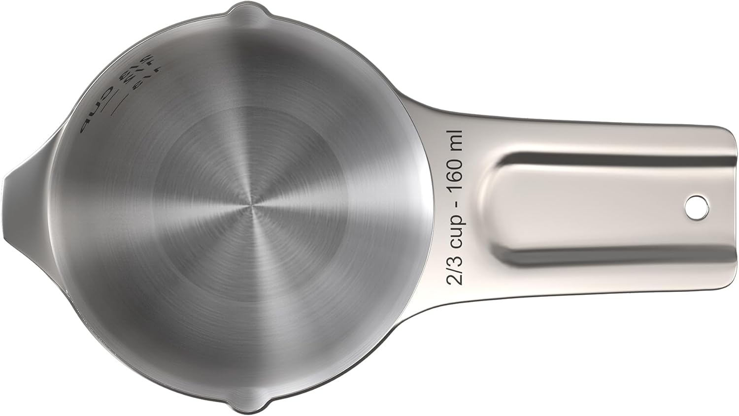 - Accurate ⅔ Cup Measuring Cup (Chrome Finish) with Embossed Markings – Clearly embossed with ⅔‑cup (⅔ taza), ½‑cup (½ taza), ⅓‑cup (⅓ taza), and 160 ml graduations. Dual US and metric markings deliver lasting accuracy that won’t fade or scratch away.