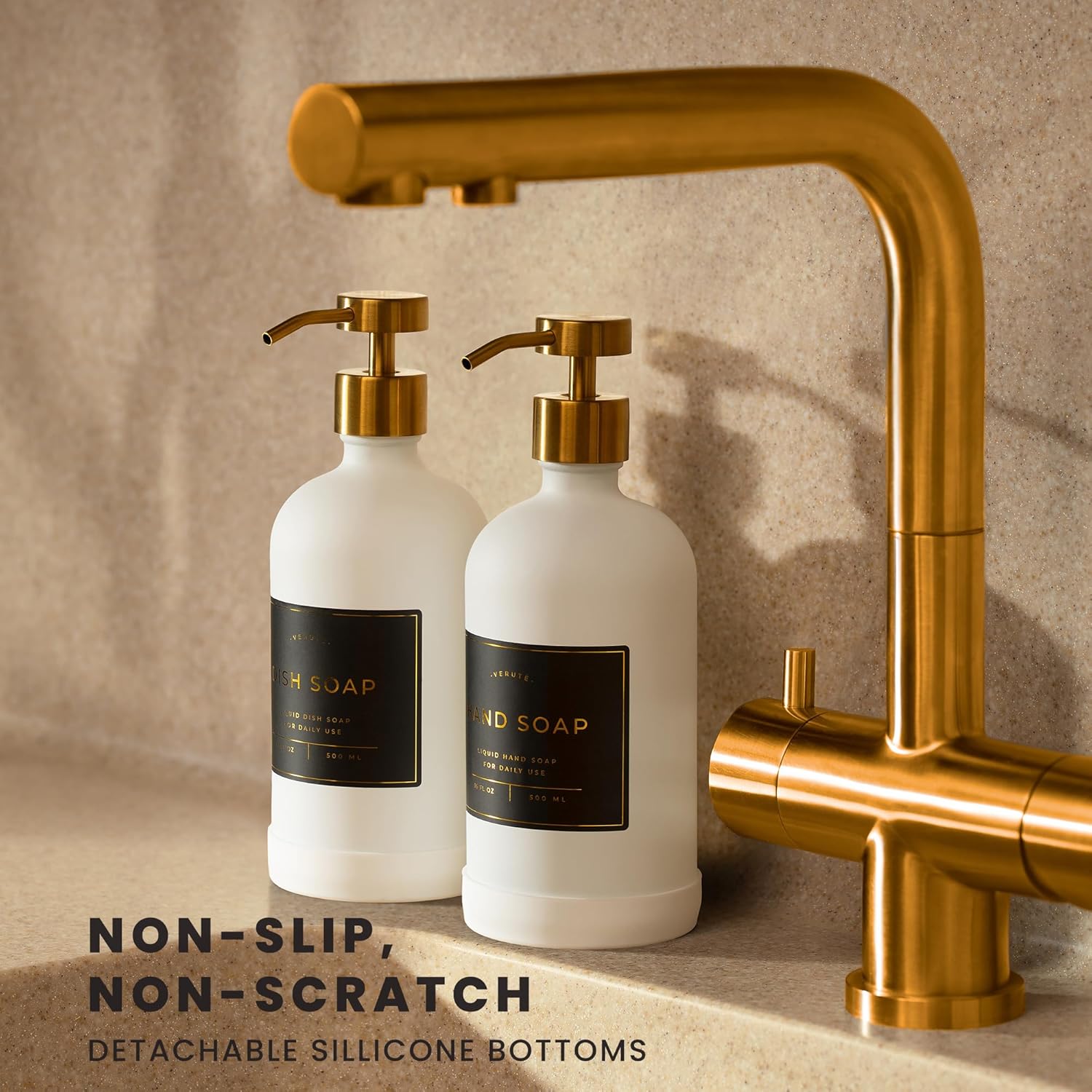 - DISPENSING MADE EASY - Fill these kitchen sink bottles with your products and dispense them with one press. Our containers have a brushed gold stainless steel pump that allows liquid to flow smoothly.