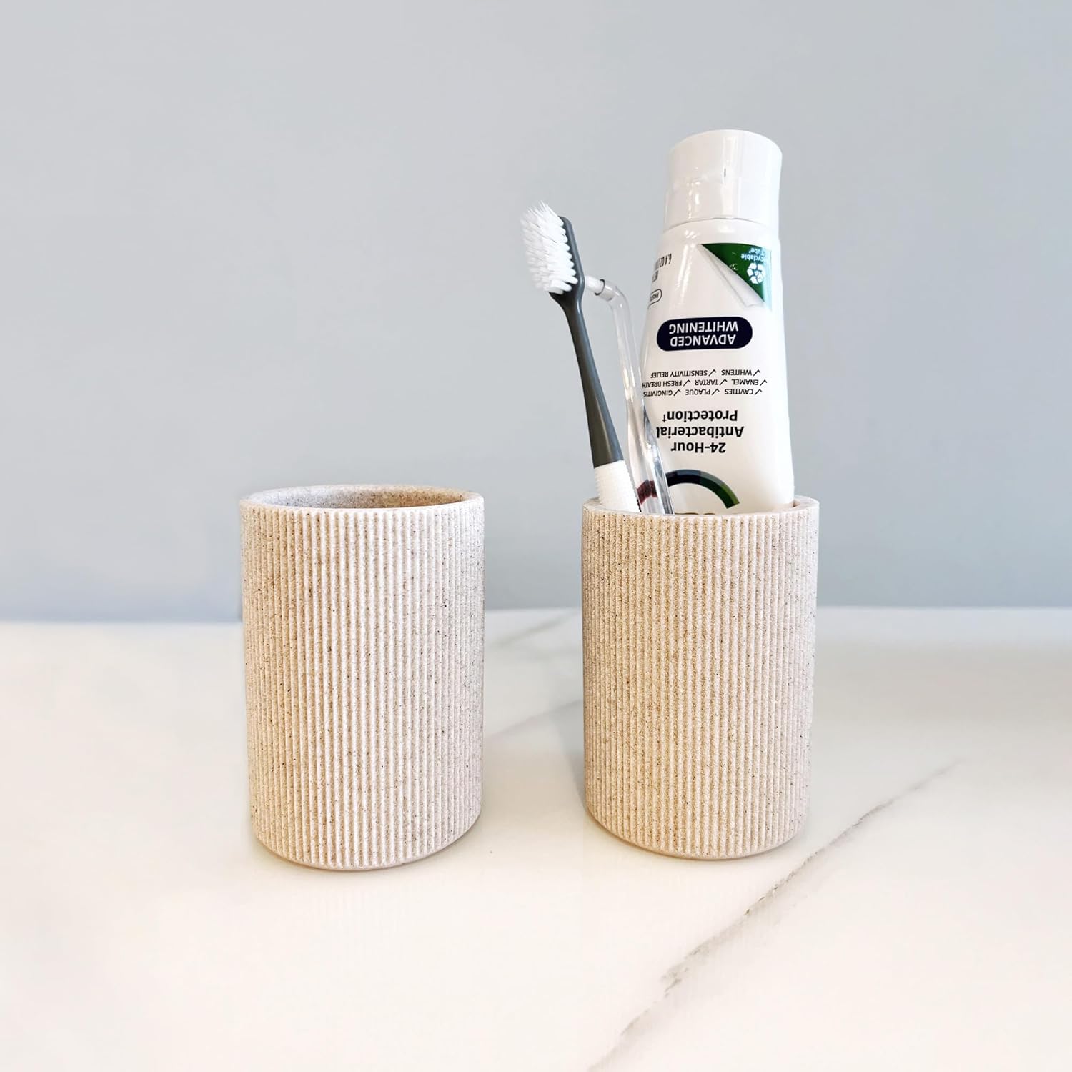 - GREAT DURABILITY: The beige bathroom tumbler cup is made of sturdy material that is much more durable than glass or ceramic. Our toothbrush holder is rust-proof and water-proof.