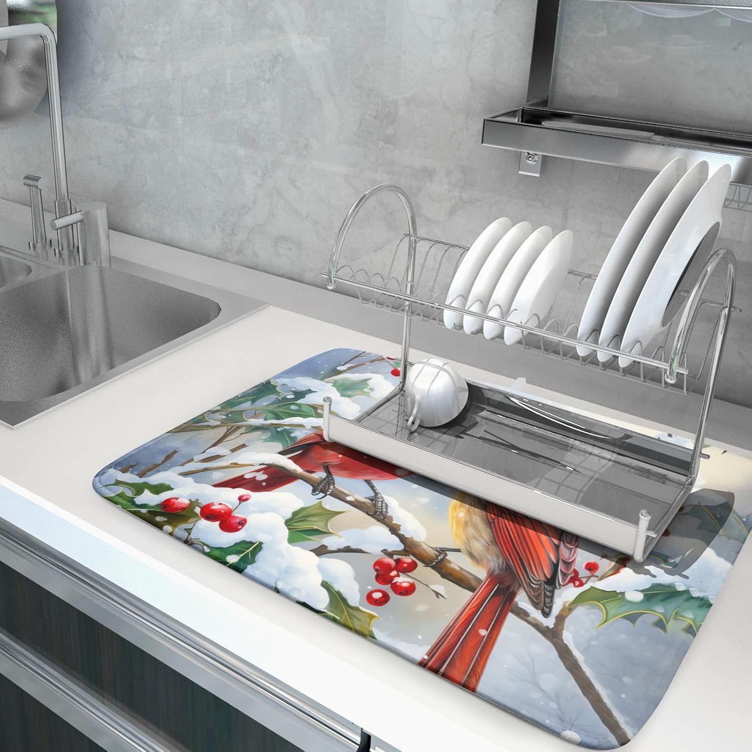 - 【Fashion Design】Our winter dish drying mat is customized with single-sided printing, which is durable and does not fade. Exquisite printing and rich colors make the kitchen vivid and more fashion. A perfect decoration in you kitchen fitting well and tightly on most counters while providing a smart and sharp look, a great gift for your family and friend, housewarming parties, weddings, birthdays and other special occasions.