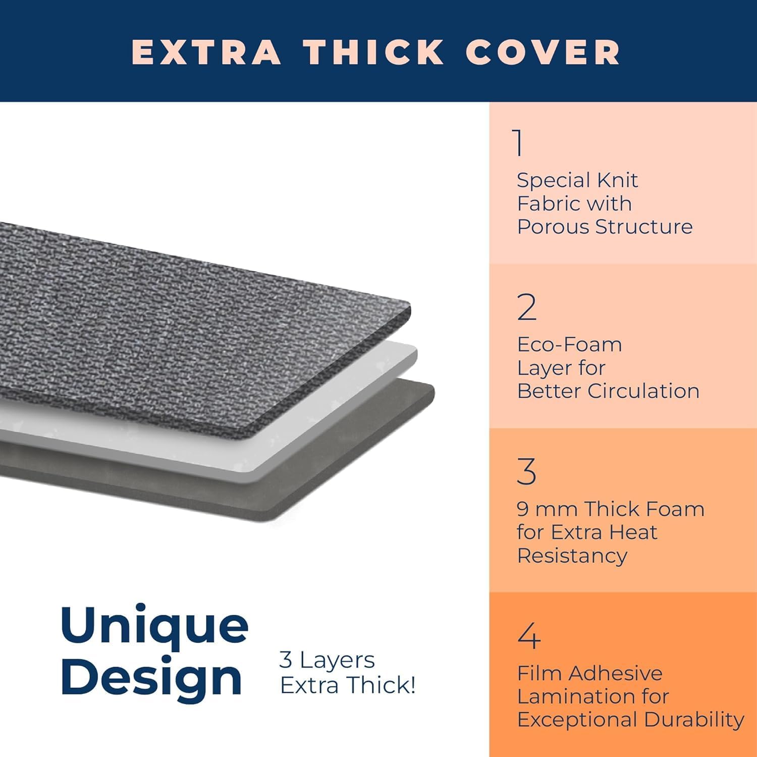 - EXTRA THICK PADDING FOR REMARKABLE DURABILITY: Heavy-duty padding (9 mm thick felt) and meticulously crafted special knitted fabric provides exceptional durability to ironing board cover. Top layer is extremely soft and heat resistant.Happhom cover is specially designed to meet a contemporary taste. Our cover with exclusive patterns and design is a great fit to family d‚cor.