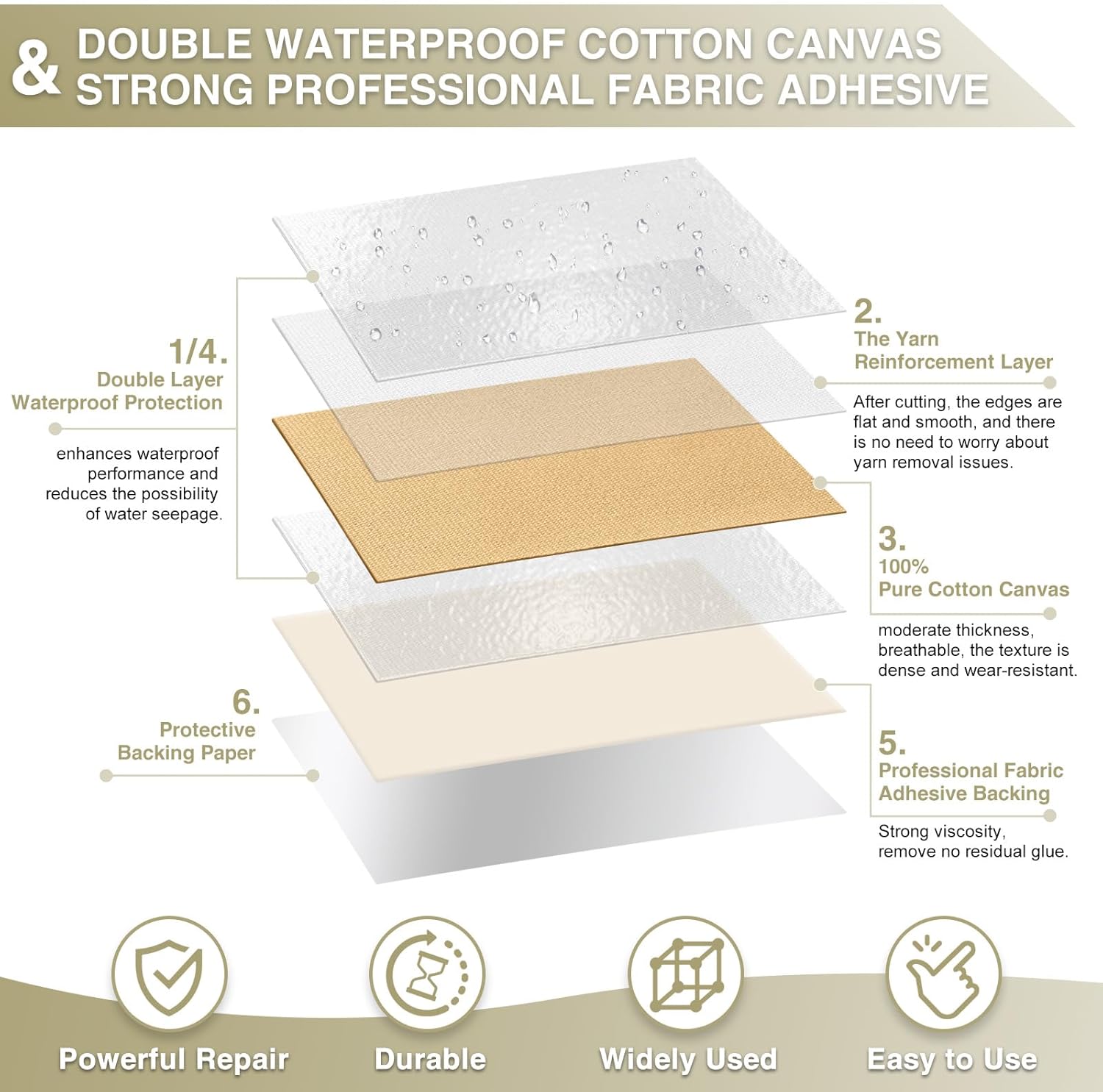 - Double Waterproof Coating & Anti-Yarn Separation Technology:The canvas fabric layer is impregnated with waterproof coating,the double waterproof layer excellently and effectively prevents rainwater penetration,making it suitable for outdoor use.The repair patch adopts anti-yarn separation technology,which makes the yarn of the patch more firm and tight,the edge is smooth and neat after cutting, the yarn is not easy to loose and separate,which is more durable than other similar products