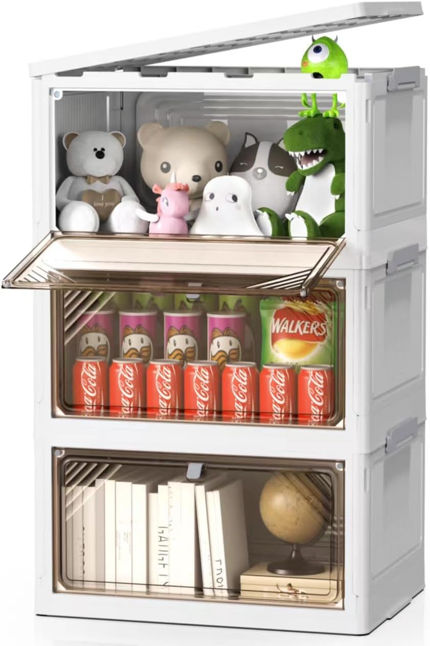 AHEONLAR 144 Quart 3 Tier Plastic Storage Bins with Lid - Foldable Stackable Storage Bins with Doors - Closet Organizers and Storage - Plastic Drawer Storage for Bedroom StudToy Room Office(48QT×3)