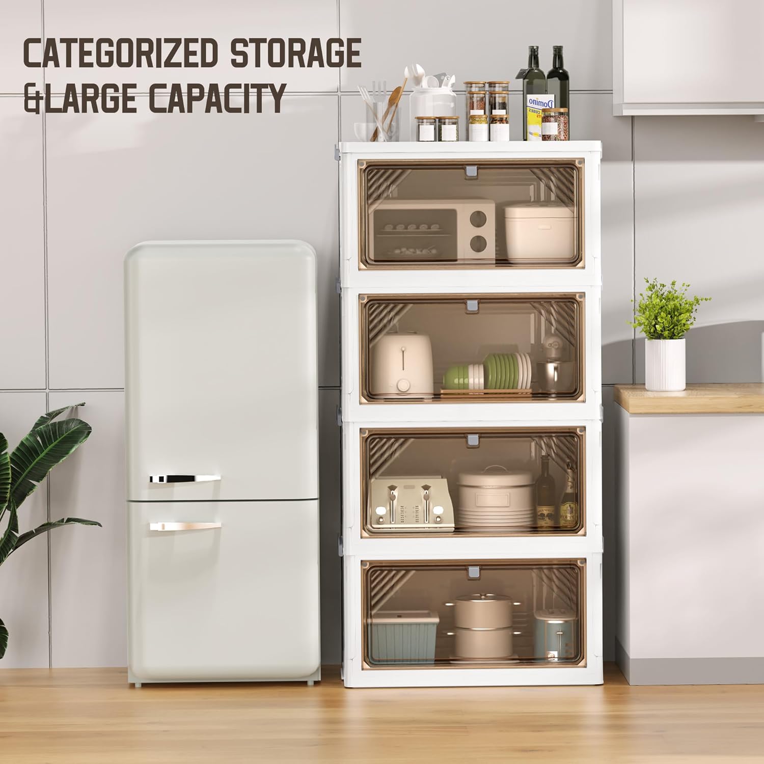 - Visual Design: Since our plastic storage bins uses a transparent front side panel, you can easily and quickly identify the items stored inside. The top stackable storage bins has two opening methods, the top lid or the front side panel, and the lower storage box opens and closes from the front side panel.