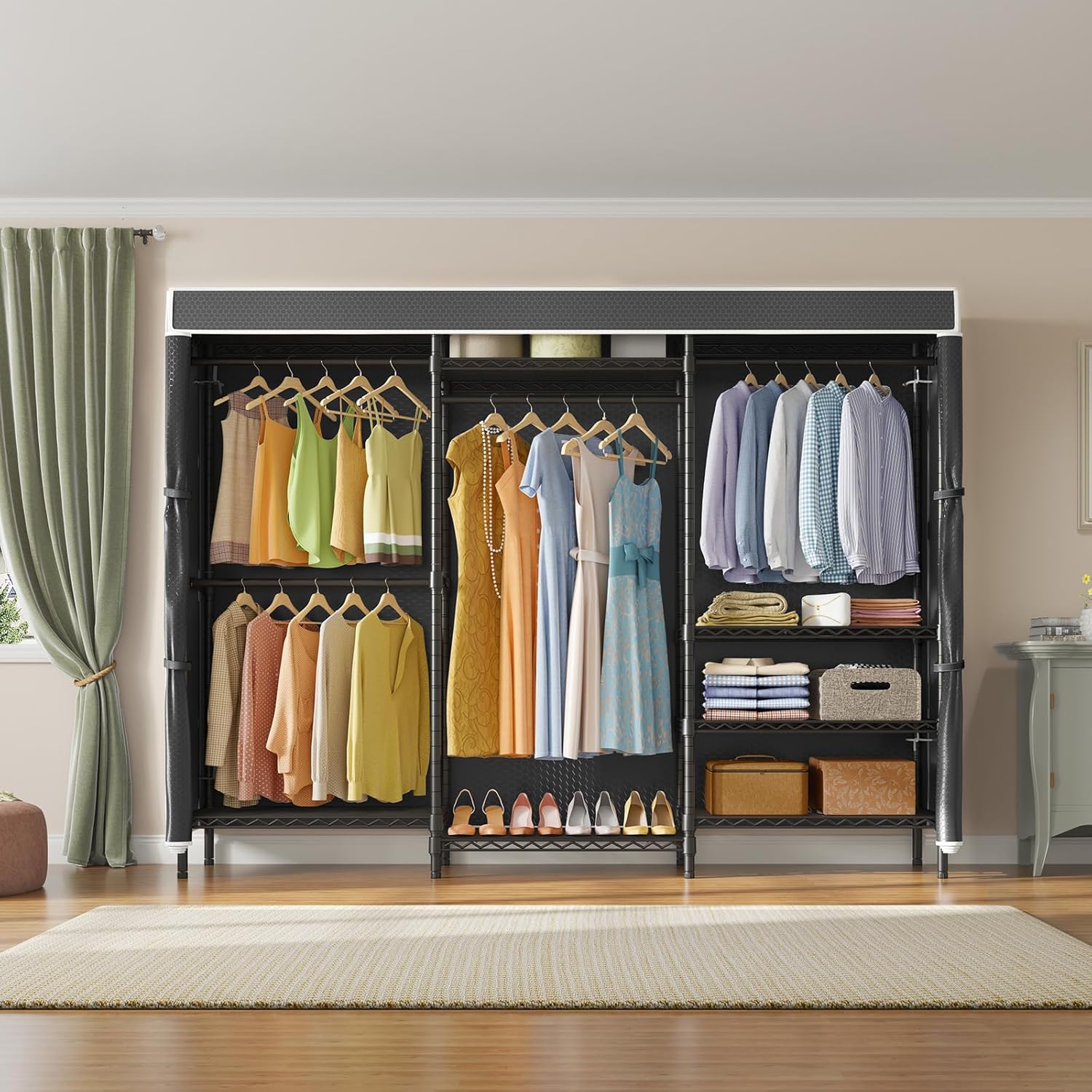 - Dimensions & Load Capacity: 86.6" L x 17.3" W x 76.4" H (includes cover). Load capacity up to 1040 lbs. Single hanging rod can support up to 70 lbs, Wire shelf can support up to 95 lbs for each.