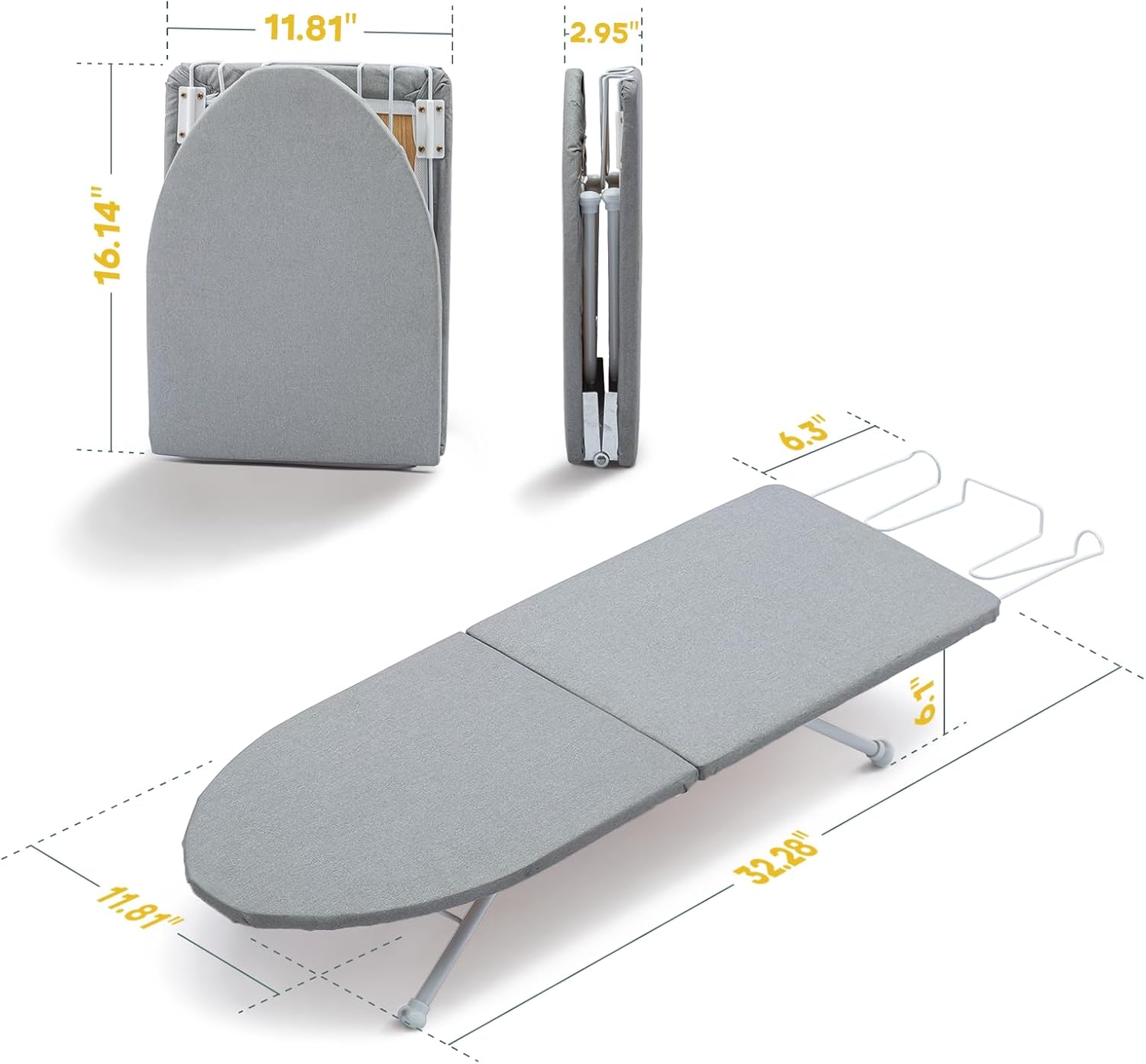 - Small Iron Board: This Table Top ironing board measures 32.28 x 11.81 x 6.1 in when opened and 16.14 x 11.81 x 2.95 in when folded; The set also includes iron holder, made of wood weighing a total of 6.6 lb, and is sturdy and durable for years to come