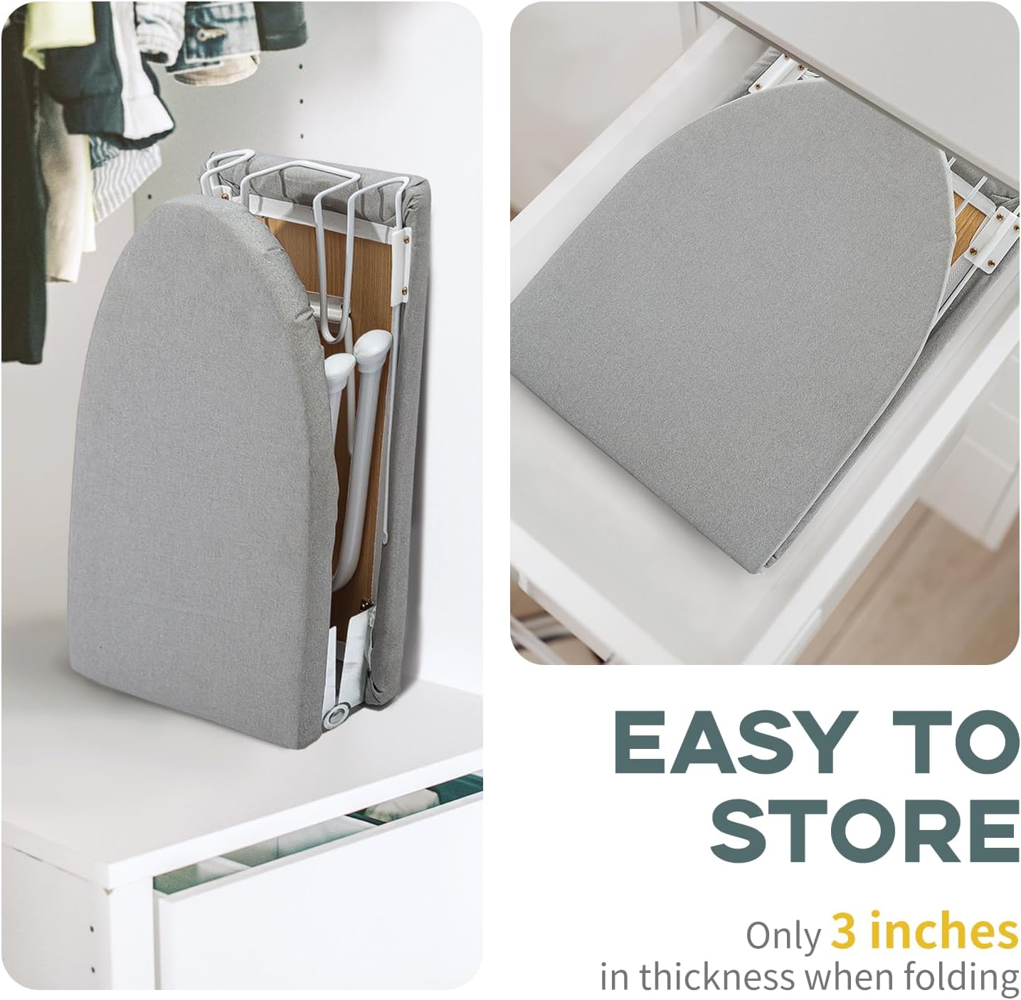 - Portable and Foldable: RAINHOL foldable ironing board is specially designed for space saving and ease of use, folding down to only 3 inches in thickness, making it ideal for small laundry rooms, dormitories and apartments