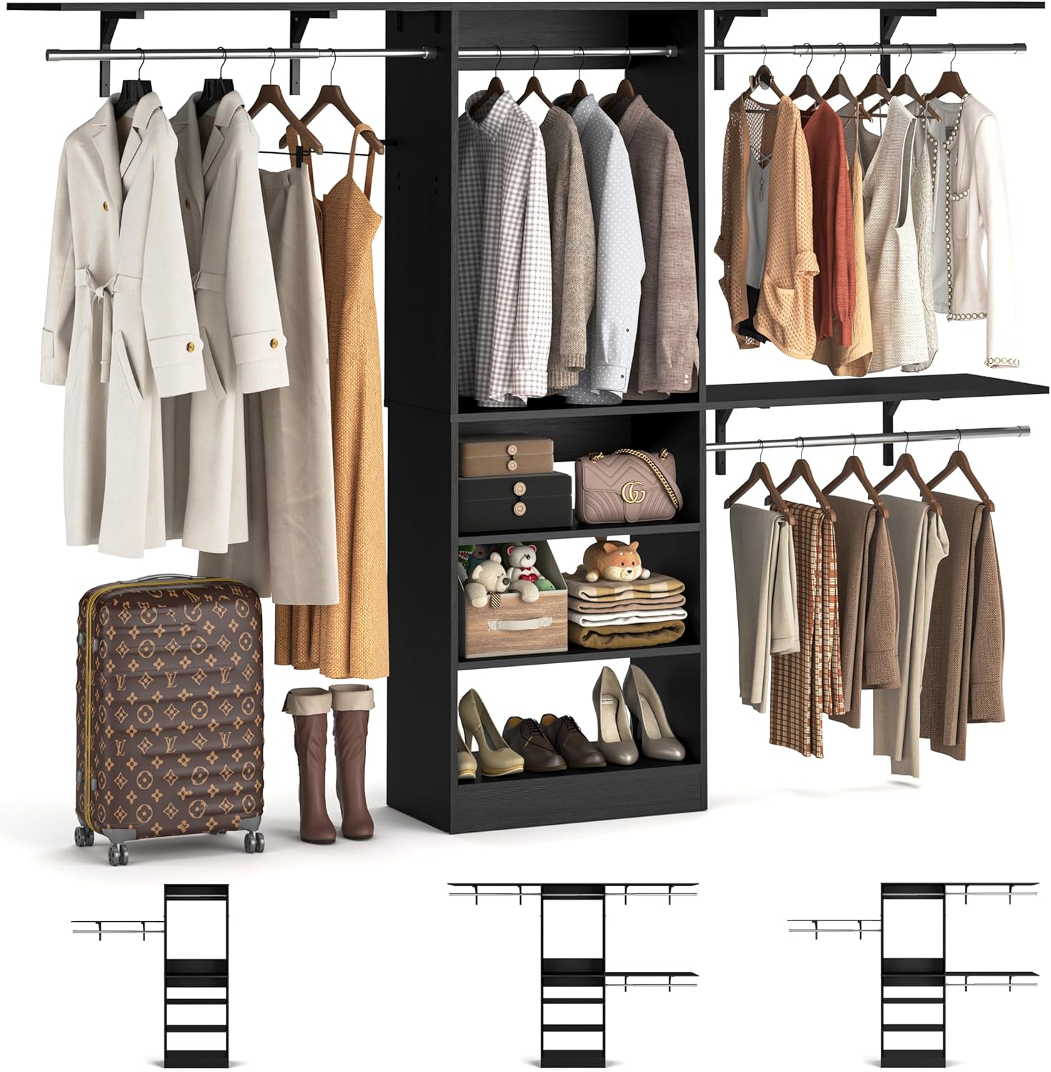 - 【8FT Closet System with 4 Storage Shelves】This closet system has a lot of storage space, it has 4 storage shelves, 3 top shelving towers which creates a custom closet system for you. You can put your clothes, bags, suitcases, socks etc. It can hold about 300+pcs of clothes.