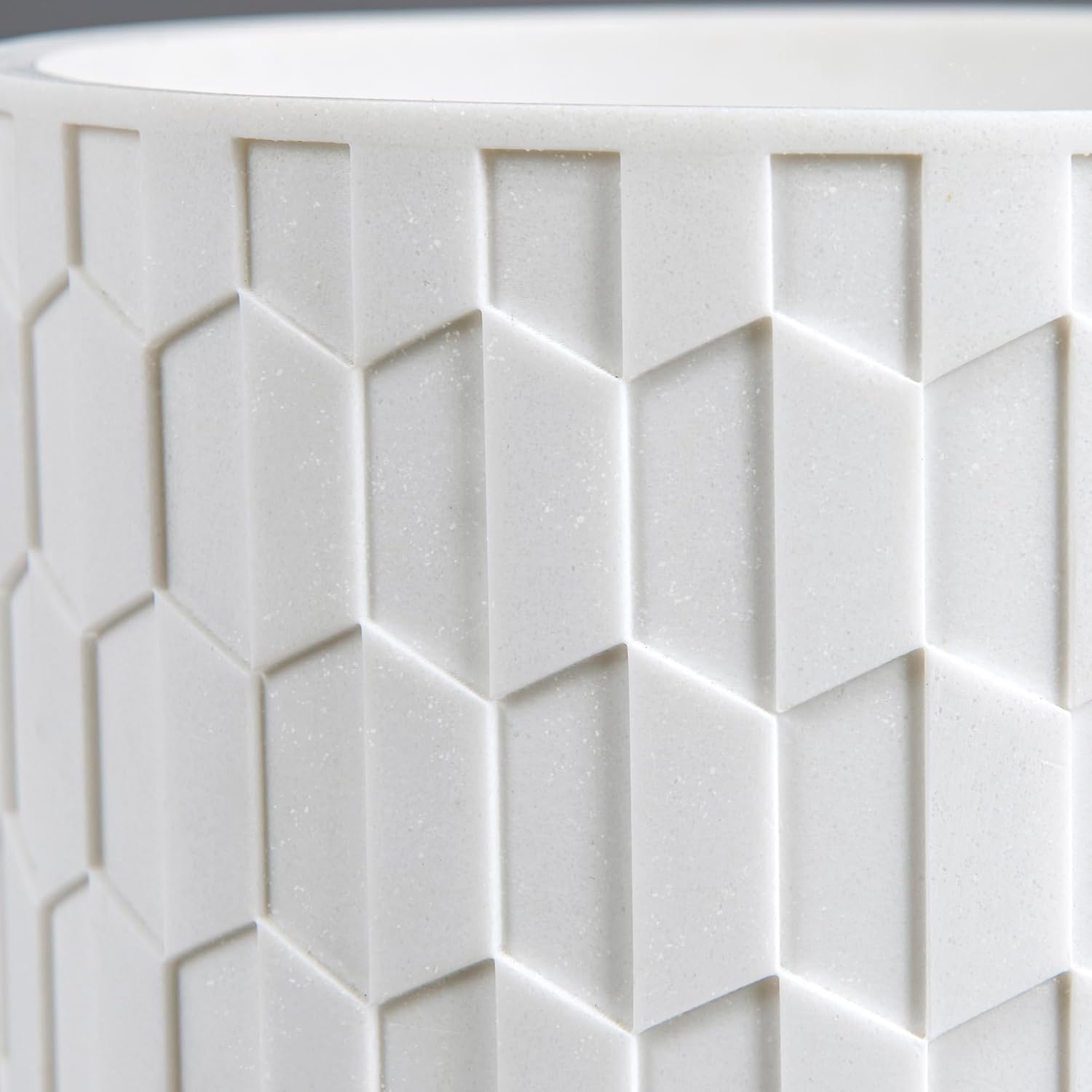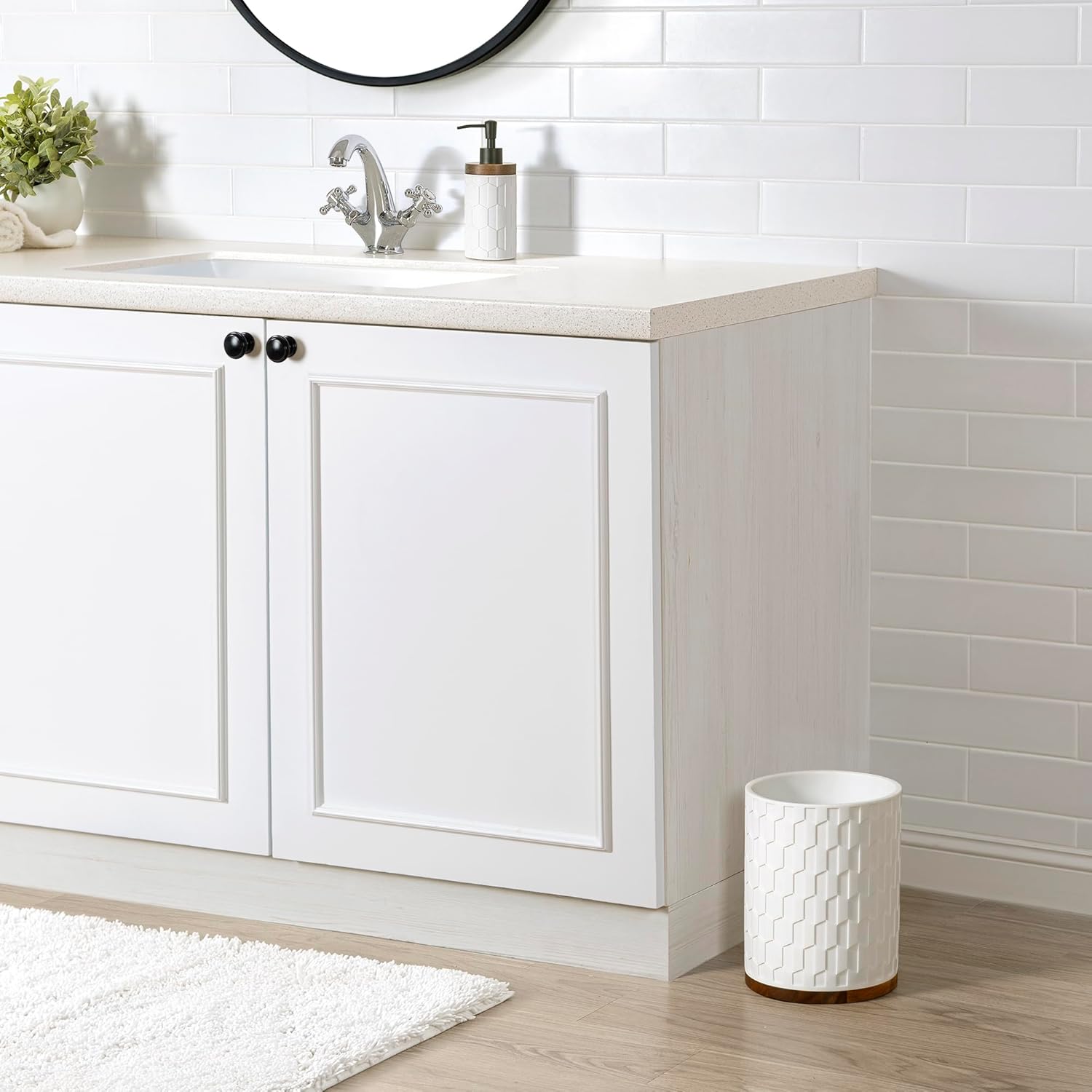 - Crisp and clean embossed geometric designed wastebasket in white with a warm wood grain base, brings sophisticated style and textural appeal to your bathroom