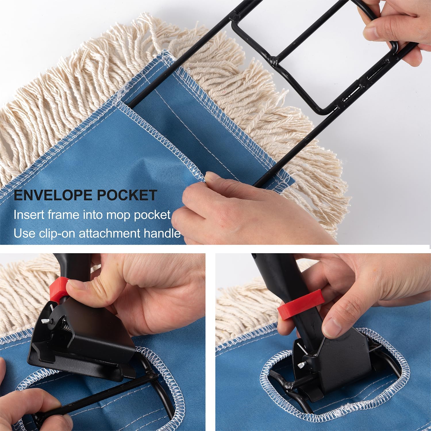 - 5" x 36", fit all standard 36" janitorial mop handle and wire frame. * Note: Mop handle is sold separately* Durable blue top with reinforced binding along the keyhole opening to prevent raveling or fraying.