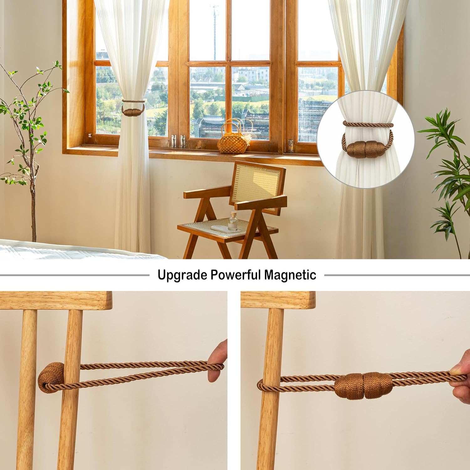 Magnetic Curtain Tiebacks Rope Curtain Tie Backs for Curtains 4 Pack Curtain Holders for Drapes Decorative Window Curtain Holdbacks, Khaki