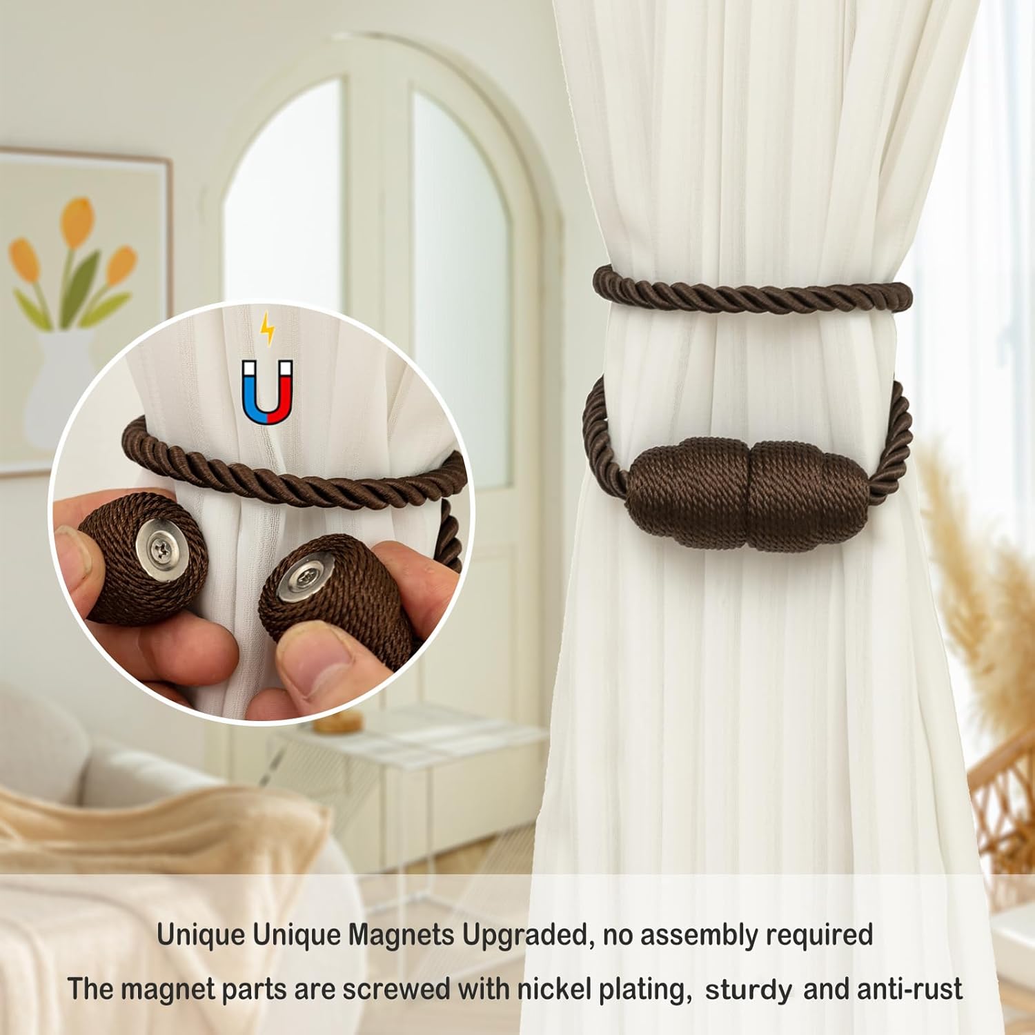 Magnetic Curtain Tiebacks Rope Curtain Tie Backs for Curtains 6 Pack Curtain Holders for Drapes Decorative Window Curtain Holdbacks, Coffee