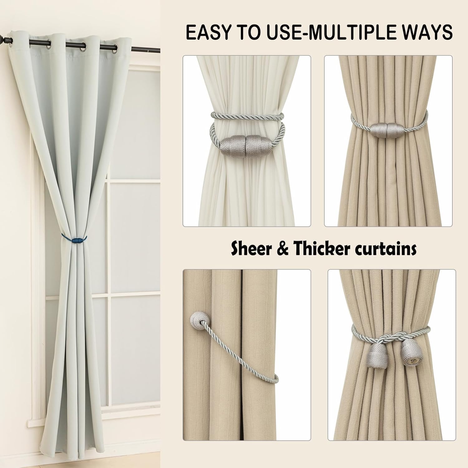 - Simple and easy to use: Our curtain holdbacks have a simple design and are very simple to install and use. Just attach them to the curtains and adjust them as needed. They also untie easily so you can open or close the curtains at any time. Whether you need to increase the practicality of your curtains or enhance the beauty of your room with decorative accents.