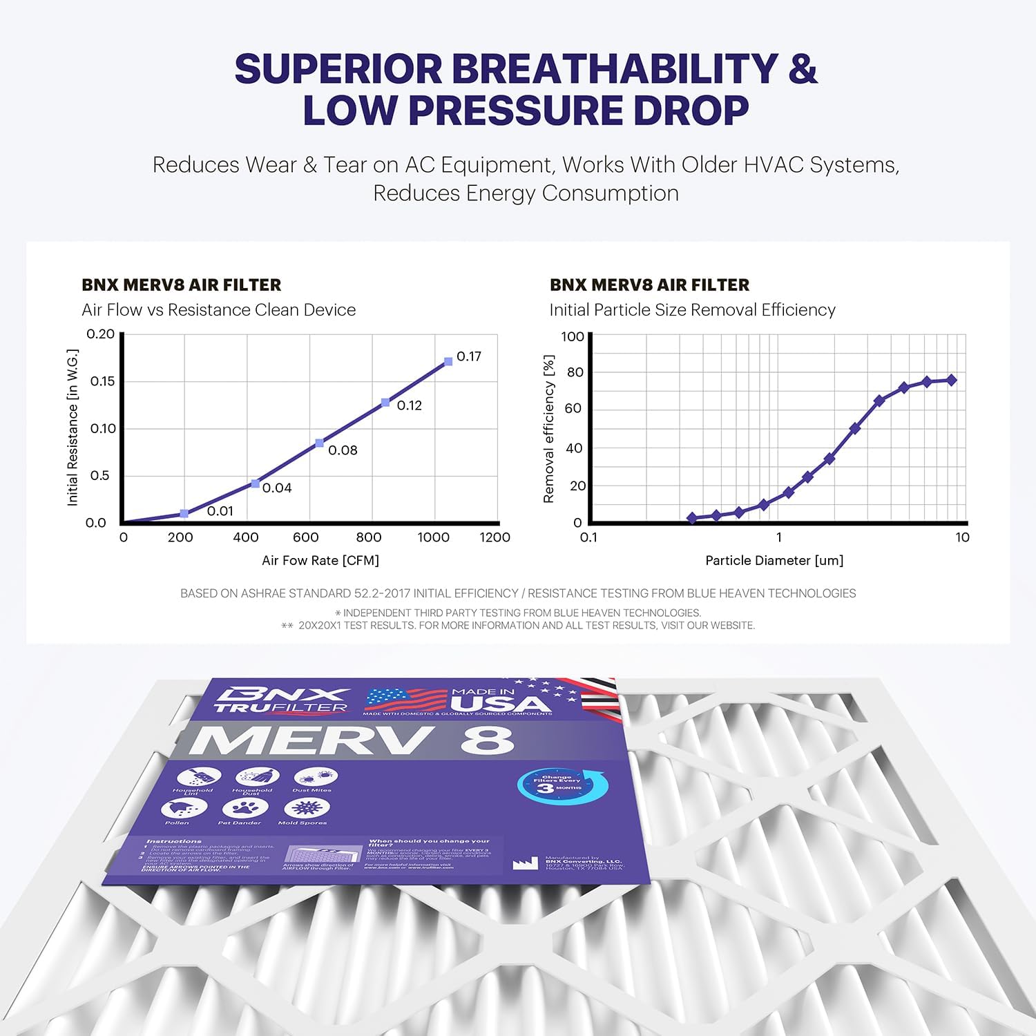 - SUPERIOR PERFORMANCE - The BNX MERV 8 100% synthetic electrostatically charged air filter media outperforms standard fiberglass filters and adopts the latest in electrostatic filtration technology to allow for industry leading superior low air flow resistance while maintaining the highest grade level of filtration.