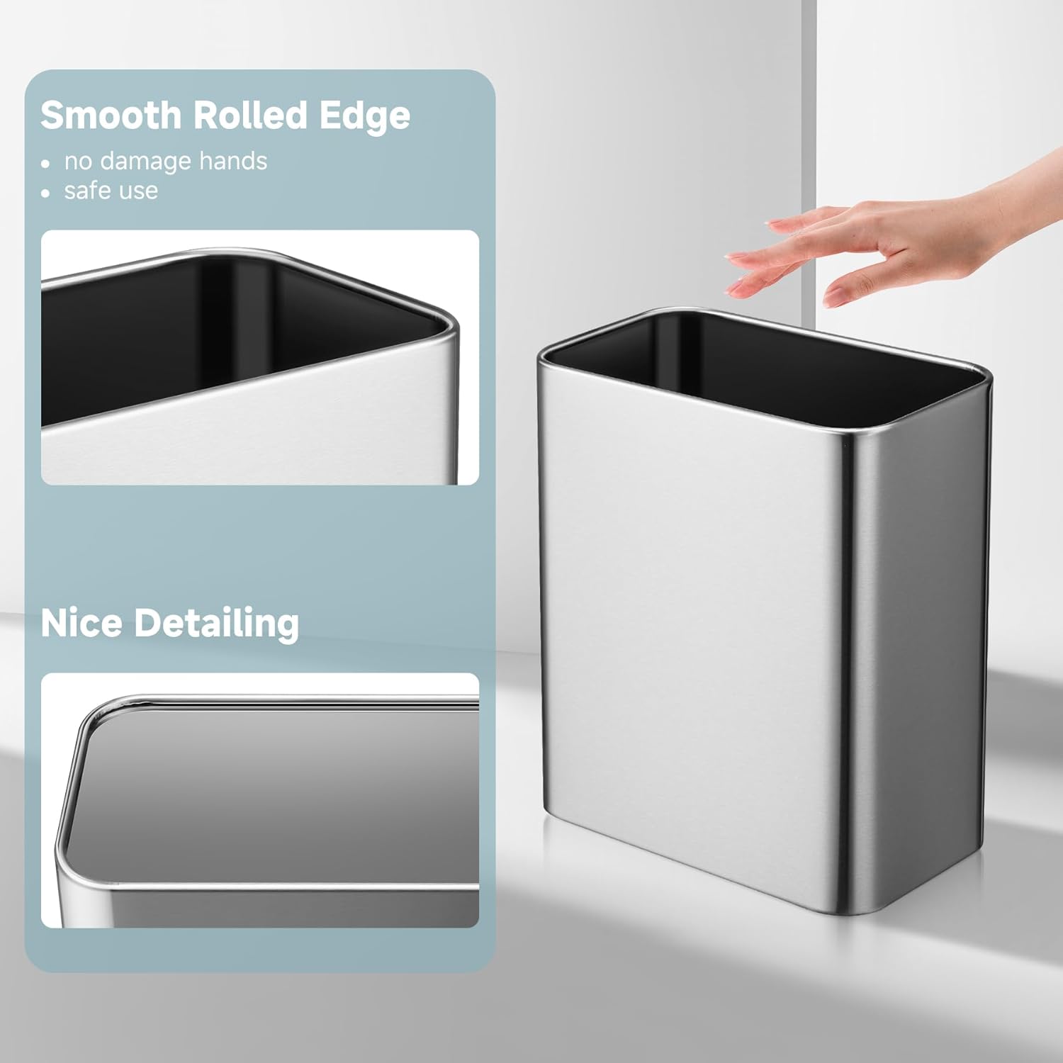 - 【Kindly Safe Design】Upgraded smooth rolled edge keep you from damaging hands or scratching the garbage bag