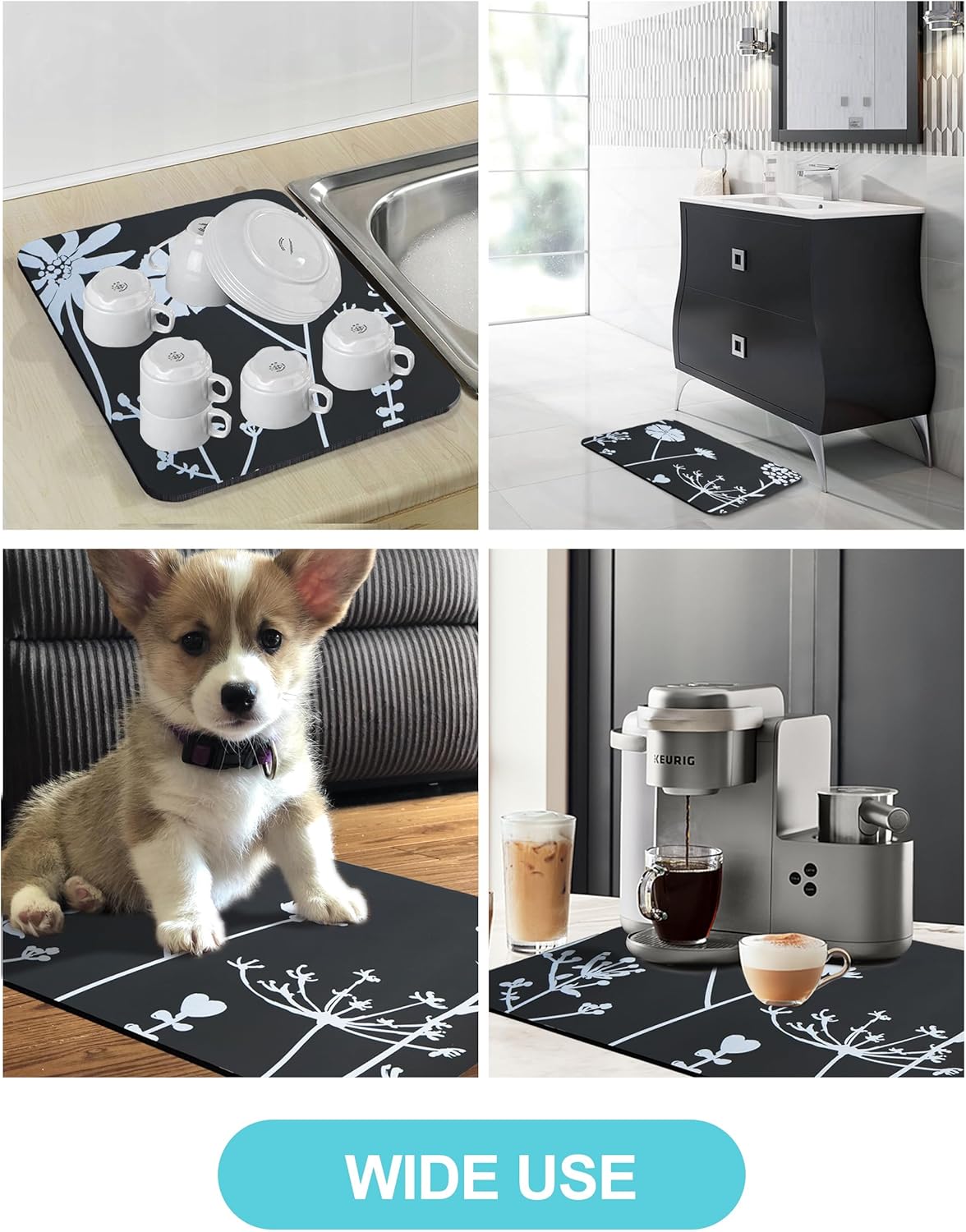 Dish Drying Mat for Kitchen Counter, 16"x24" Dish Drying Pad with Non-slip Rubber Backed, Hide Stain Anti Absorbent for Kitchen Counter, Drying Mat for Coffee Machine Dish Rack (Gray Daisy)