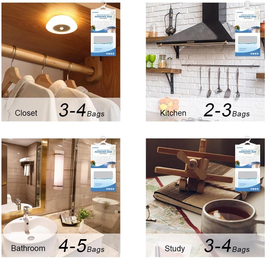 - 【Widely used】CANAGER dehumidifier bags have strong hook design, are suitable for most enclosed spaces, such as closets,basements,cabins,bathrooms,garages,laundry rooms and other enclosed spaces. Effectively protect your clothes and valuables from moisture.is perfect dehumidifier for closet,bedroom,kitchen,bathroom.