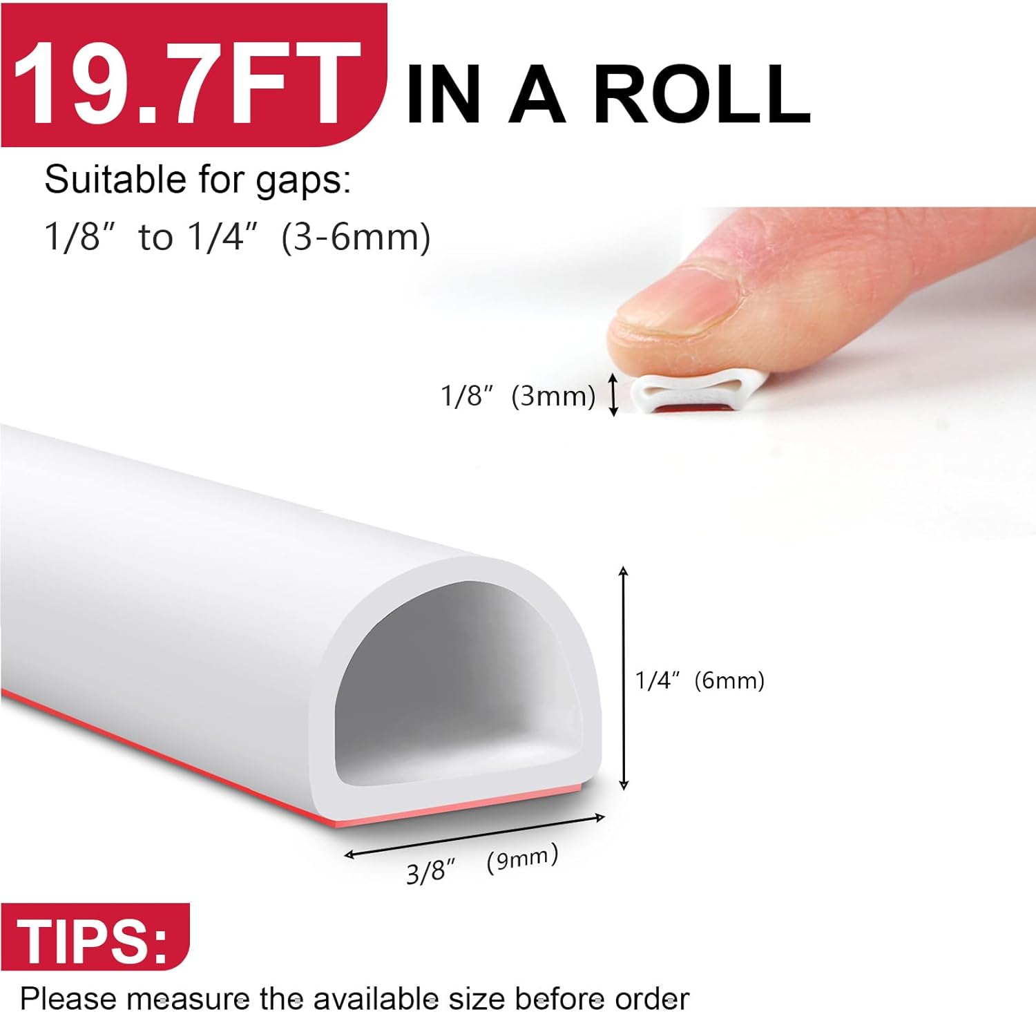 - Package Includes: The door weather stripping is 19.7 feet (6 meters) long, with a width of 3/8 inch (9mm) and a thickness of 1/4 inch (6mm). It is designed to fit gaps from 1/8 to 1/4 inch (3 to 6mm). Please measure the gap width before purchasing