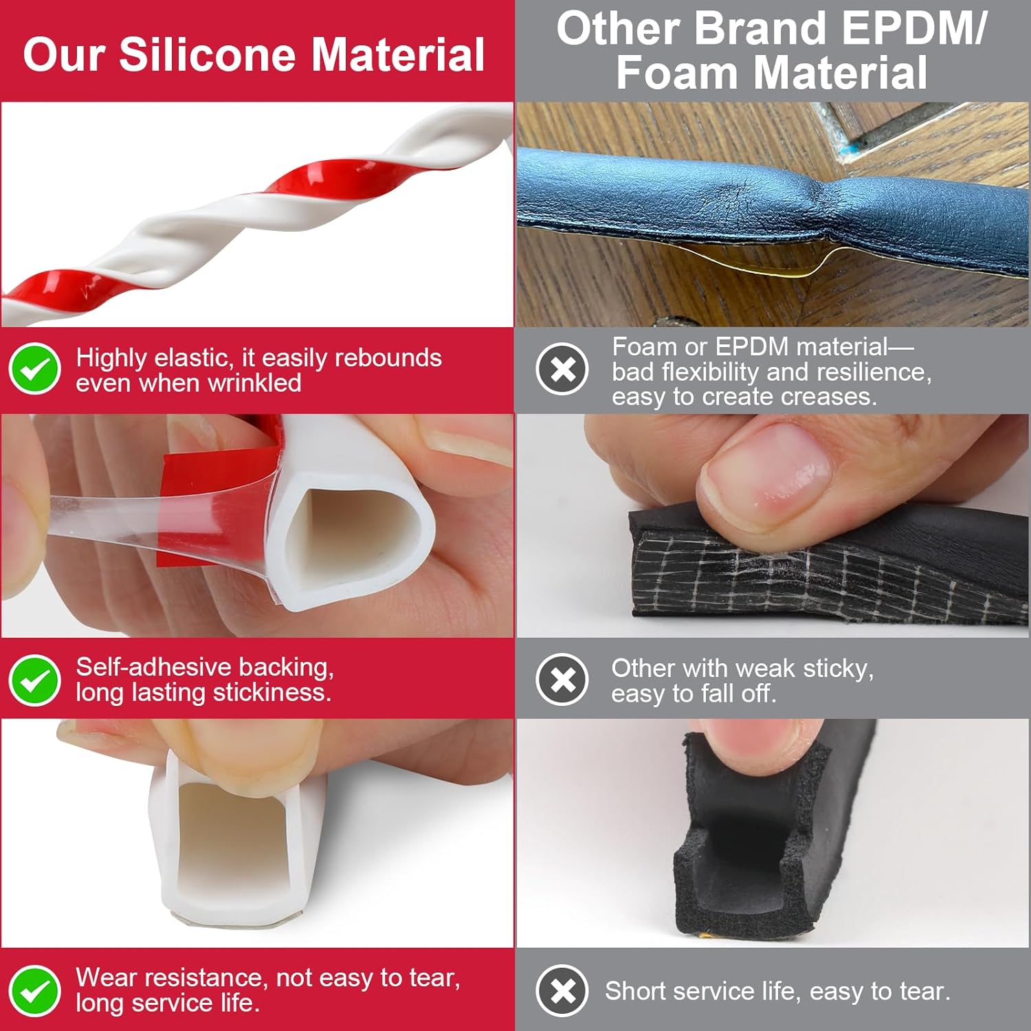 - High-Quality Silicone Material: Our door seal strip is crafted from premium silicone, offering enhanced durability and flexibility compared to foam or EPDM rubber strips. Silicone provides superior temperature resistance (up to 200°C), remains flexible in cold conditions, and resists cracking, ensuring long-lasting performance