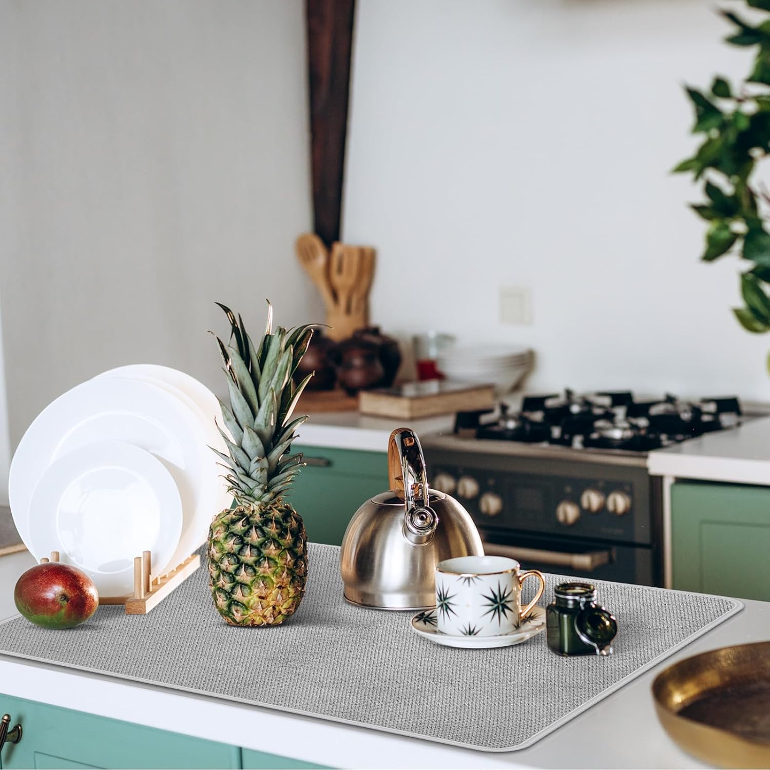 - Reliable Material and Attractive Design: get the ideal balance of functionality and style with our kitchen drying mats for dishes; Made from microfiber, these mats exhibit impressive water absorbent property, ensuring a dry, clean countertop; Their pleasing gray and blue color will effortlessly blend with most kitchen interior, enhancing its aesthetics