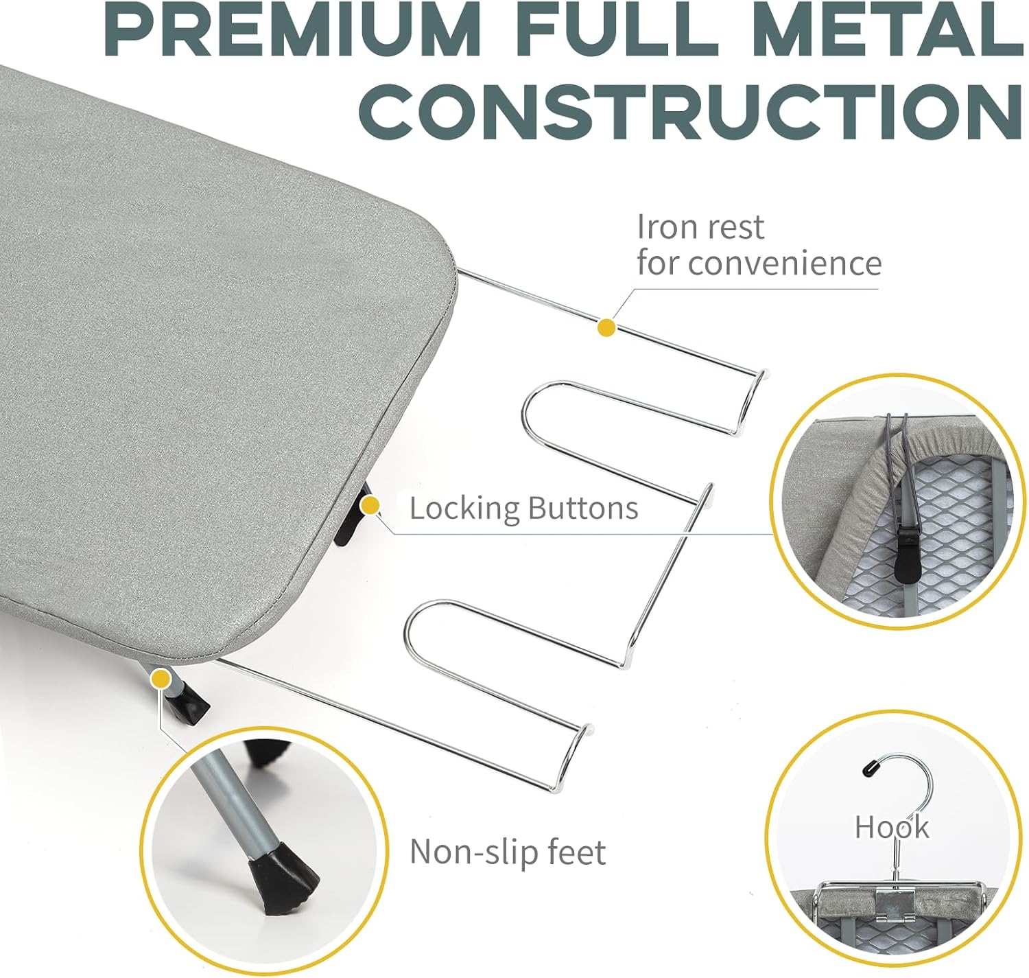 - Sturdy and Stable: The feet is sturdy and durable with a non-slip silicone cap, and the sturdy structure ensures that the mini ironing board table top is stable enough