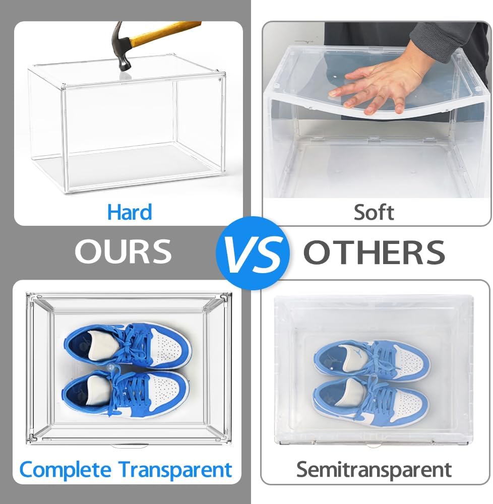 - 【Fit Your High-Tops】: Each shoe crate measures 14.1" L x 10.6" W x 8.9" H, providing ample space for up to size 15 women's shoes or size 14 men's shoes. The sturdy construction, made of thick high-hardness PET acrylic panels, ensures that your high-tops, sneakers, and boots are securely stored. Reliable
