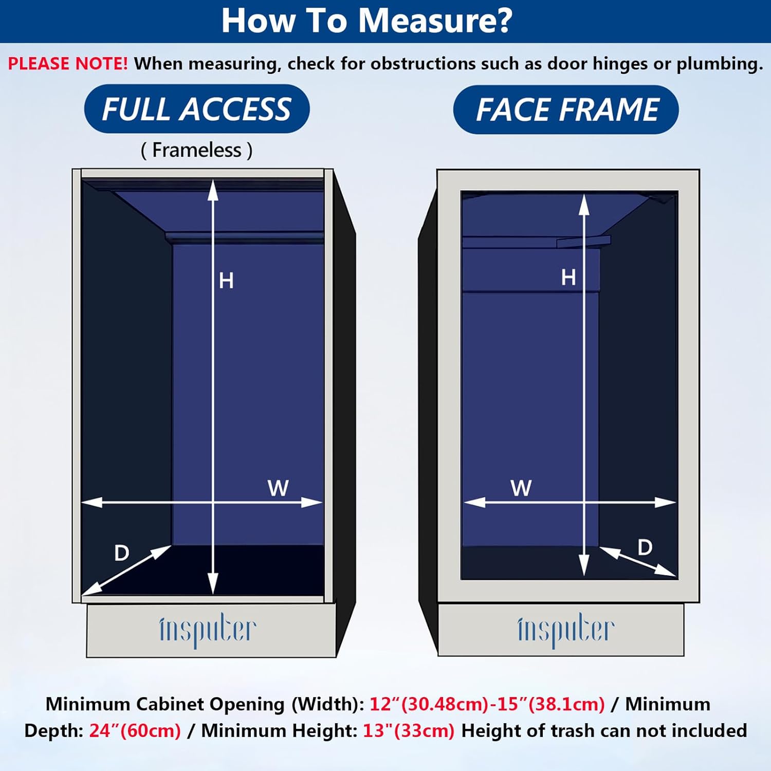 - Space Saving: Say goodbye to unsightly trash cans taking up valuable kitchen space! The Insputer cabinet trash can pull out kit fits perfectly underneath cabinets, making it easy to hide recycling and garbage storage in the cabinets, preventing odors from emanating from your trash, and maximizing every inch of storage space in your kitchen. (Note: When used under the sink, you need to pay attention to the obstruction space of the downspout)