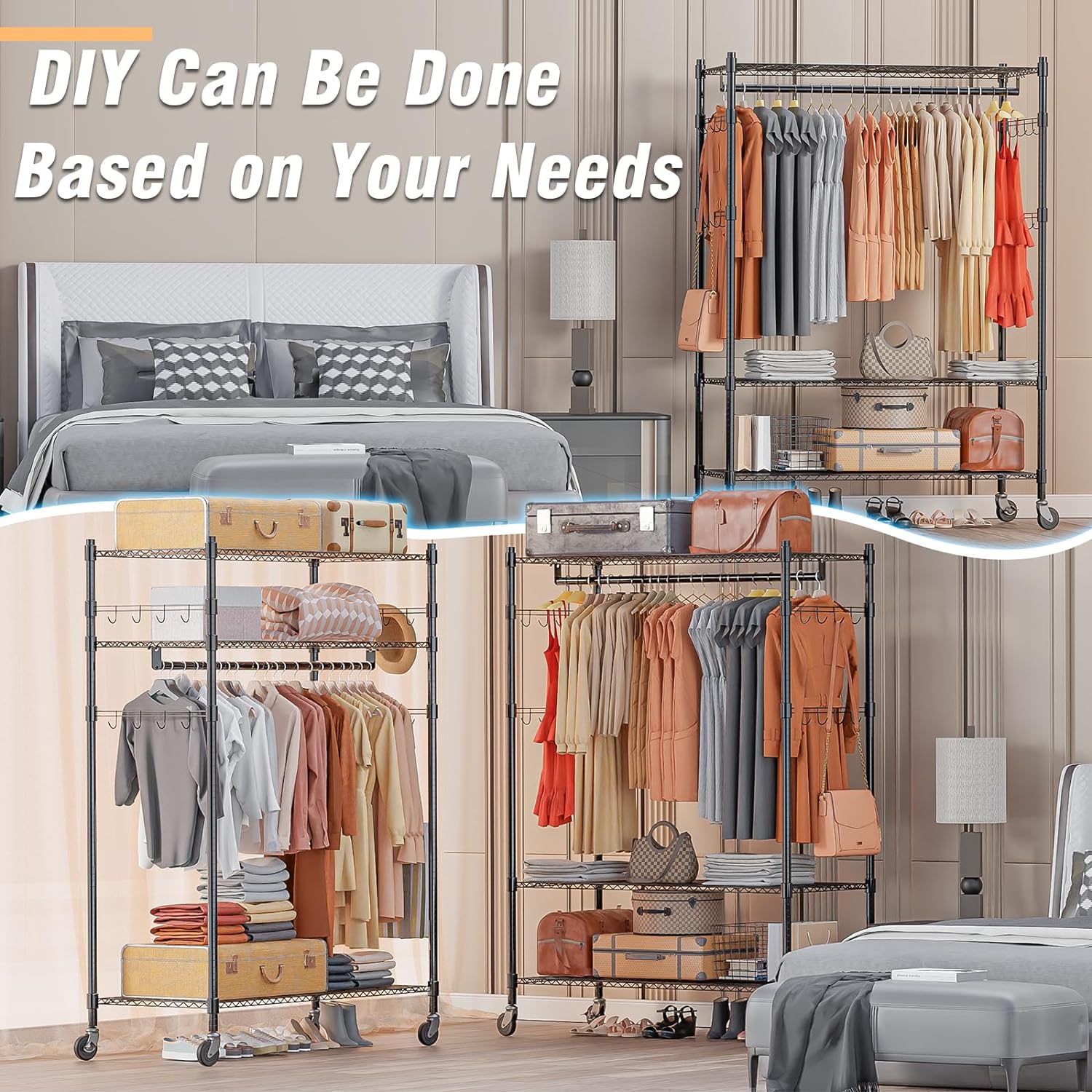 - 【LOCKABLE 360° WHEELS】 Equipped with 4 rolling wheels, 2 of them are locking wheels, designed to allow you to roll this clothing garment rack where ever you need in home. Easy access to bedroom, cloakroom, clothing store, laundry room, walk-in closet and more