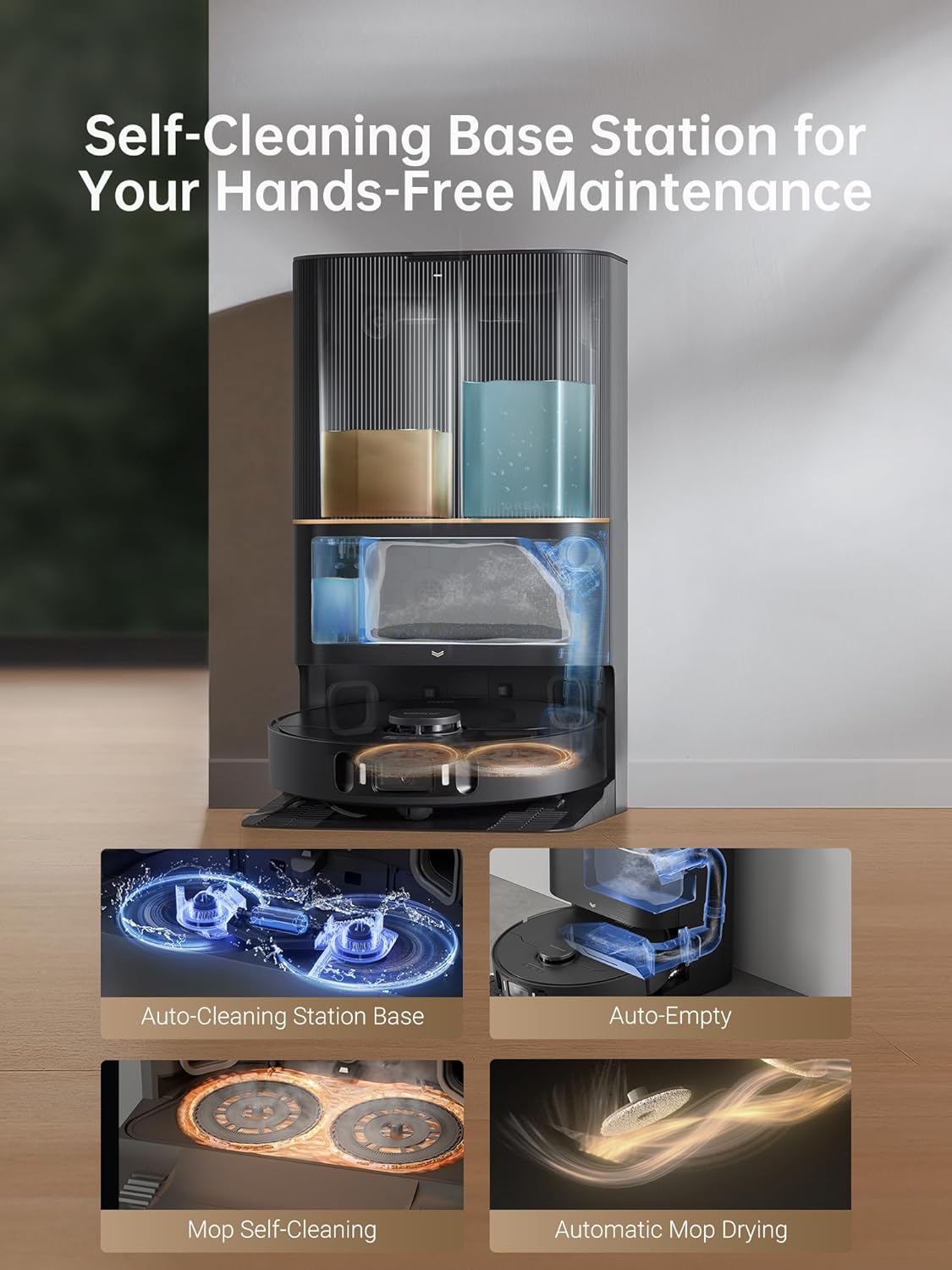 - Auto Maintenance Keeps You Hands-Free: The vacuum can empty its dustbin, refill water for mopping, and wash its mop and the washboard, ensuring continuous freshness and saving you time on cleaning.