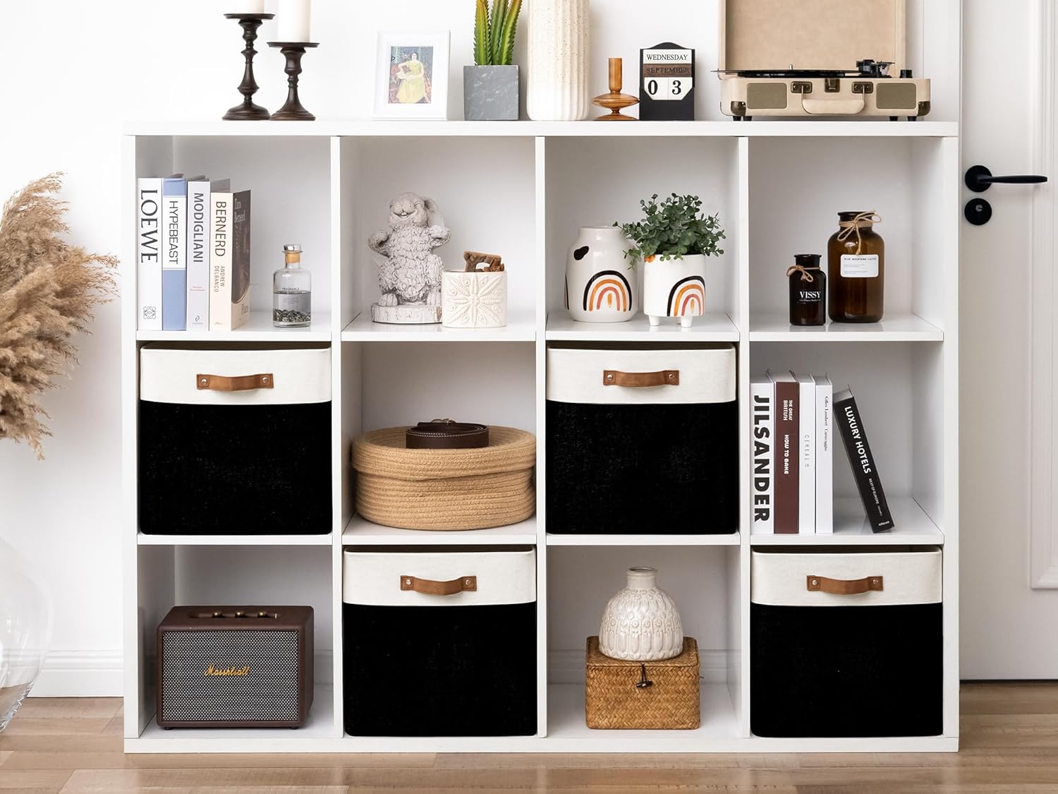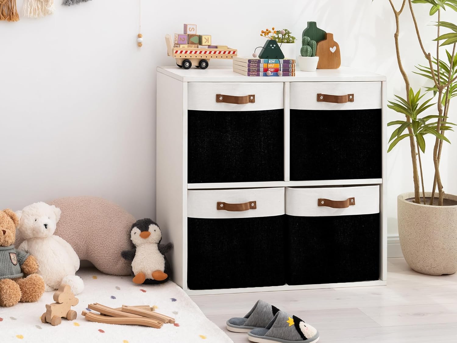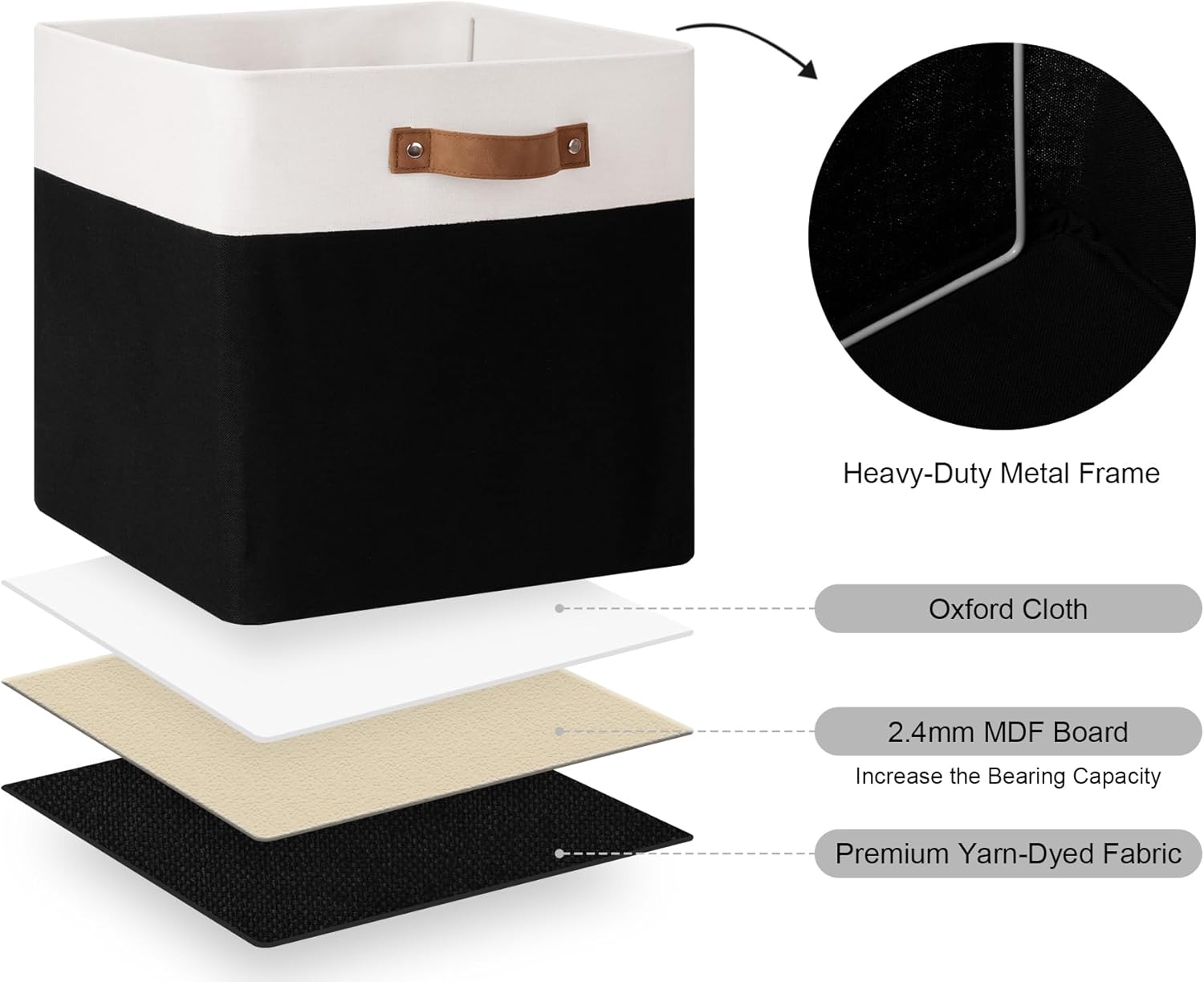 StorageWorks 13x13 Inches Storage Cube, Fabric Storage Bins with PU Handles, Collapsible Organizer Baskets for Closet, Black and White, 4-Pack