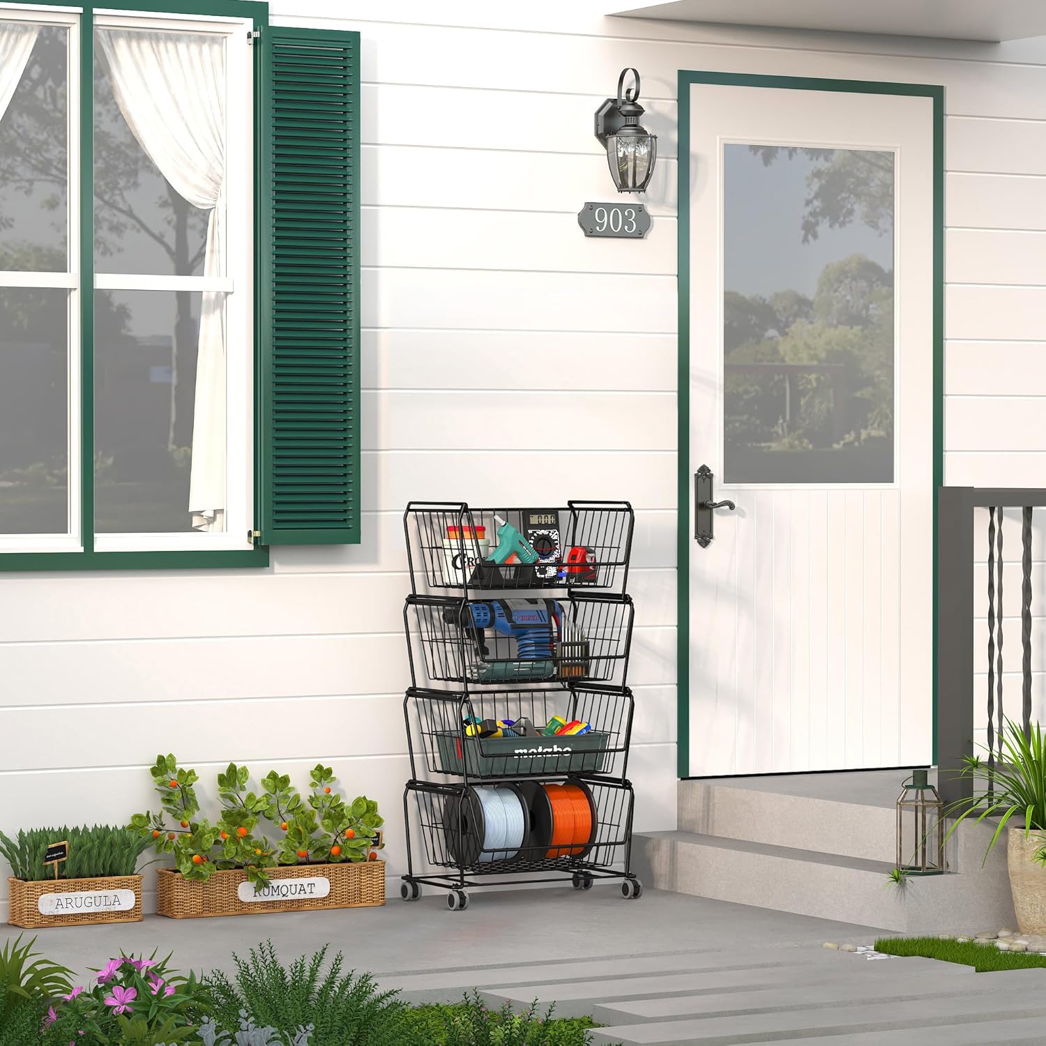 - 【Suitable Capacity】Each individual basket size: L17''x W11.5''x H8'', 4 tier storage rack set (wheels included) size: L17''x W11.5''x H31.6''. Enough space with open design, this metal storage basket rack allows for visible storaging, convenient for sorting, you can put in or find out your item very easy in the basket. A perfect storage/space save solution for your home, kitchen, pantry closet, bedroom, bathroom, office, laundry rooms, craft rooms, playrooms garage and so on