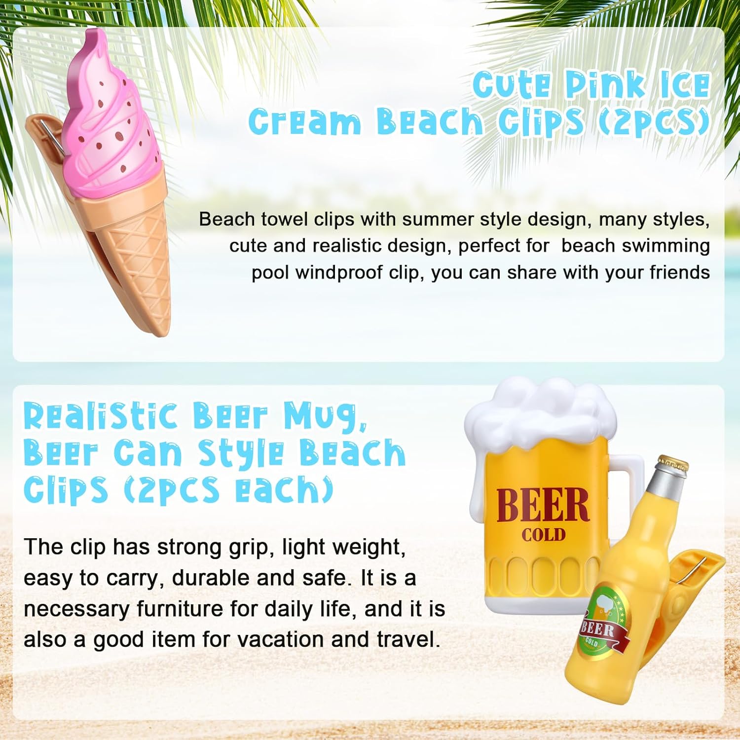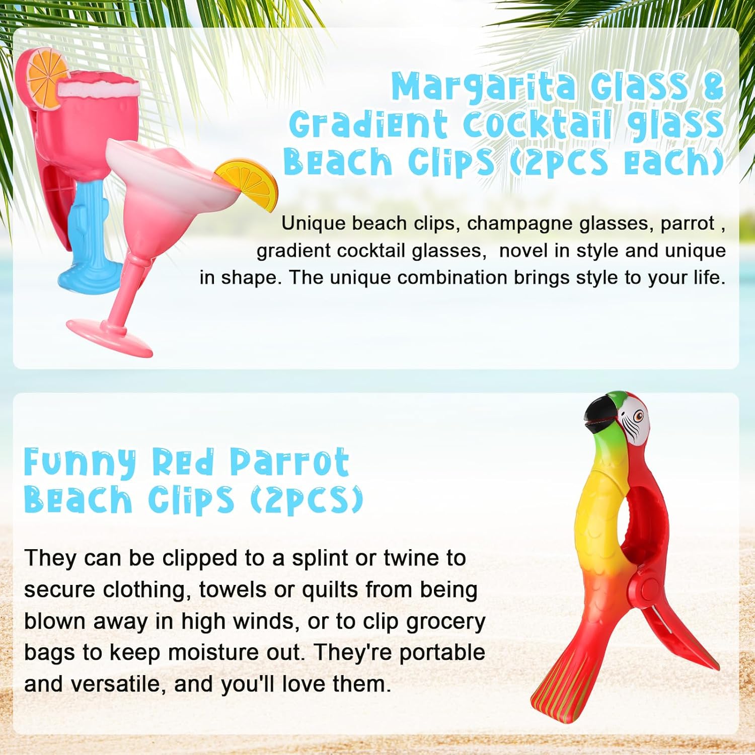 - Vibrant and Funny: these beach towel clips adopt beer mug, lemon glasses, cocktail glasses, wine bottle, ice cream and parrot styles, look vibrant and funny, you can use them to clip cloths, towels or bedding